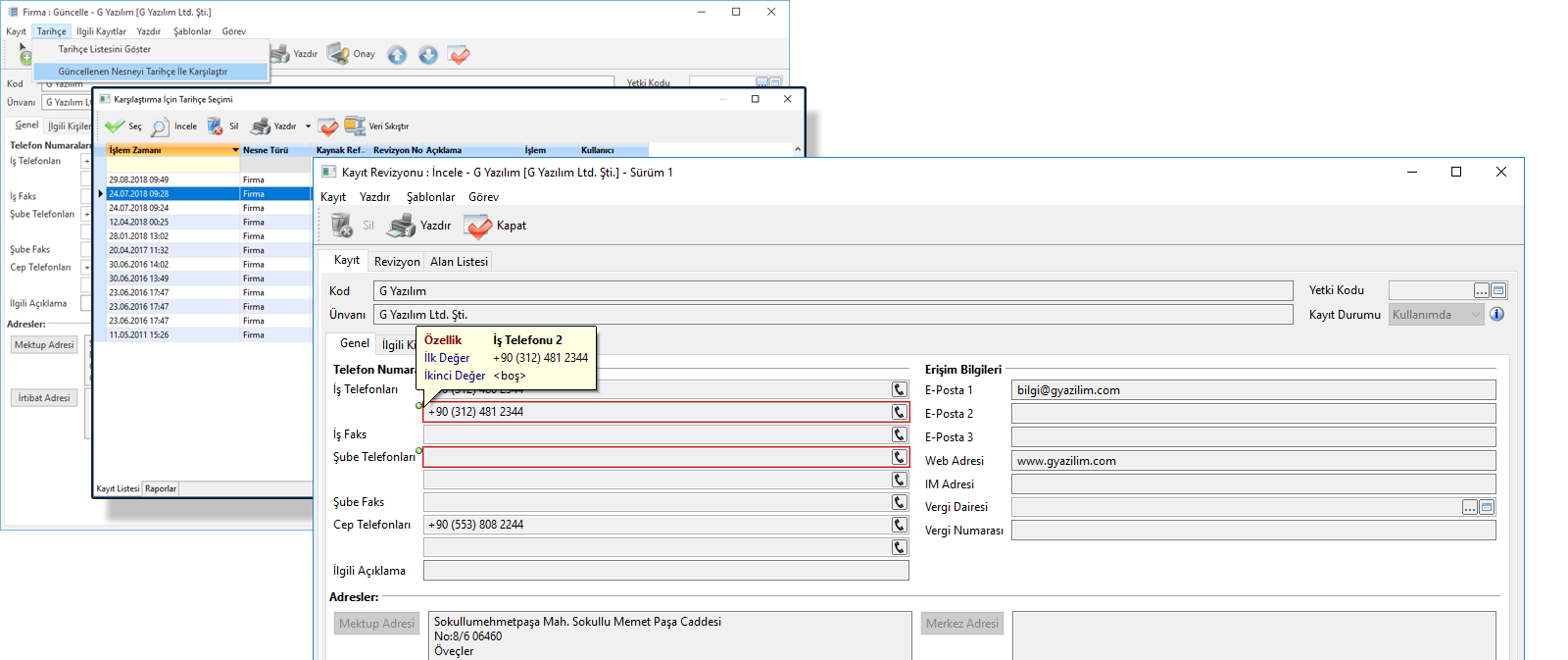 Örnek olarak bir firma telefon bilgisinin kimler tarafından ne zaman değiştirildiğini ve her değişiklikteki eski ve yeni değerleri görebilirsiniz.