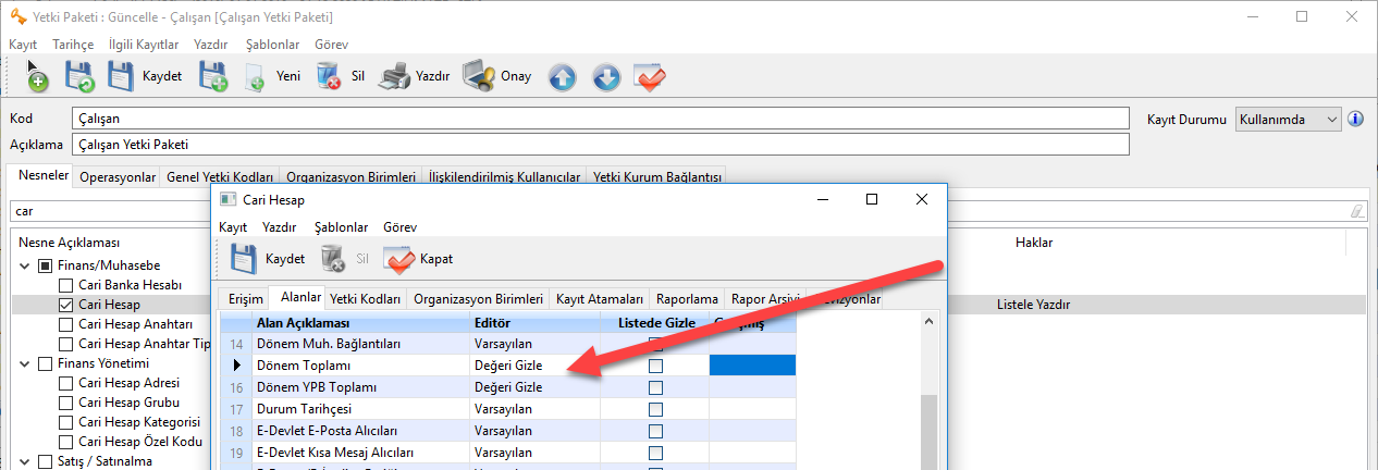 Örnek : Kullanıcı cari hesabı görsün ama borcu alacağını görmesin.