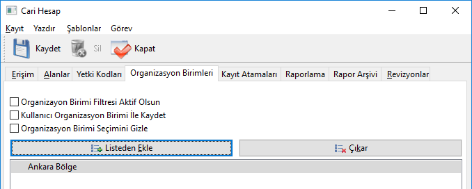 Organizasyonel birim kullanımı ile kayıtlar hiyerarşik olarak yetkilendirilebilir. Kullanıcıların kayıt ettiği nesnelerin otomatik olarak kullanıcı organizasyonel birimi ile kayıt edilmesi sağlanmaktadır.