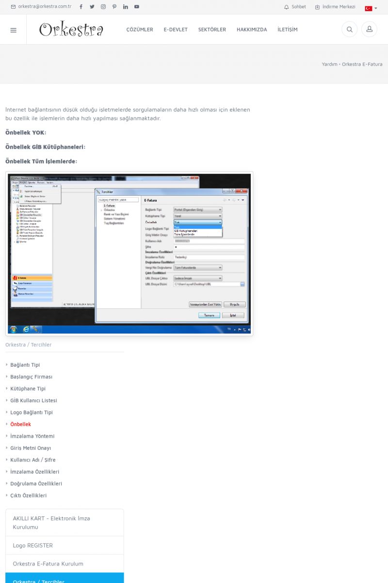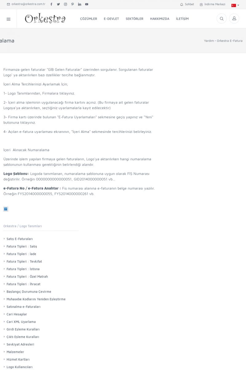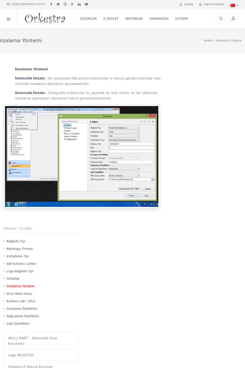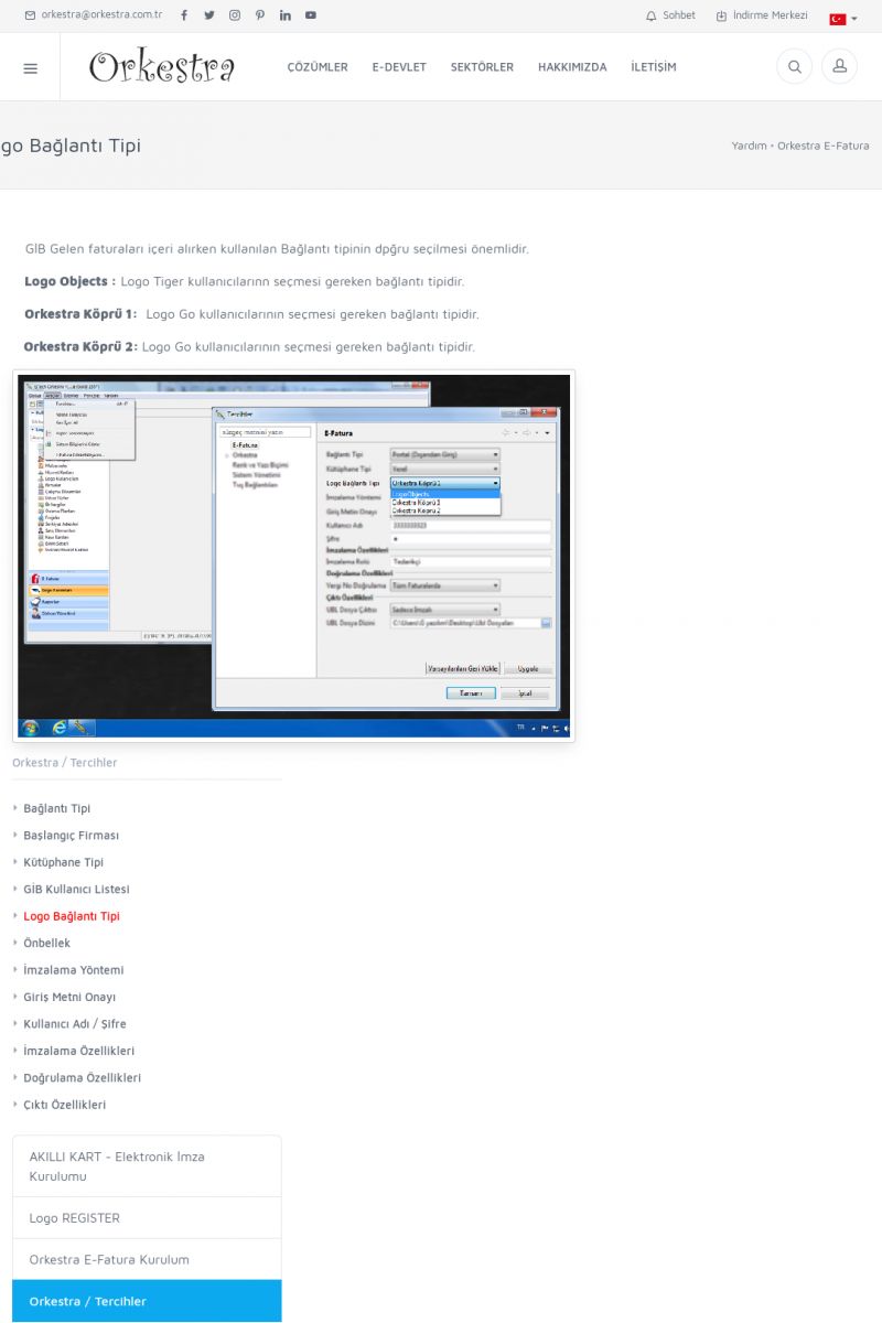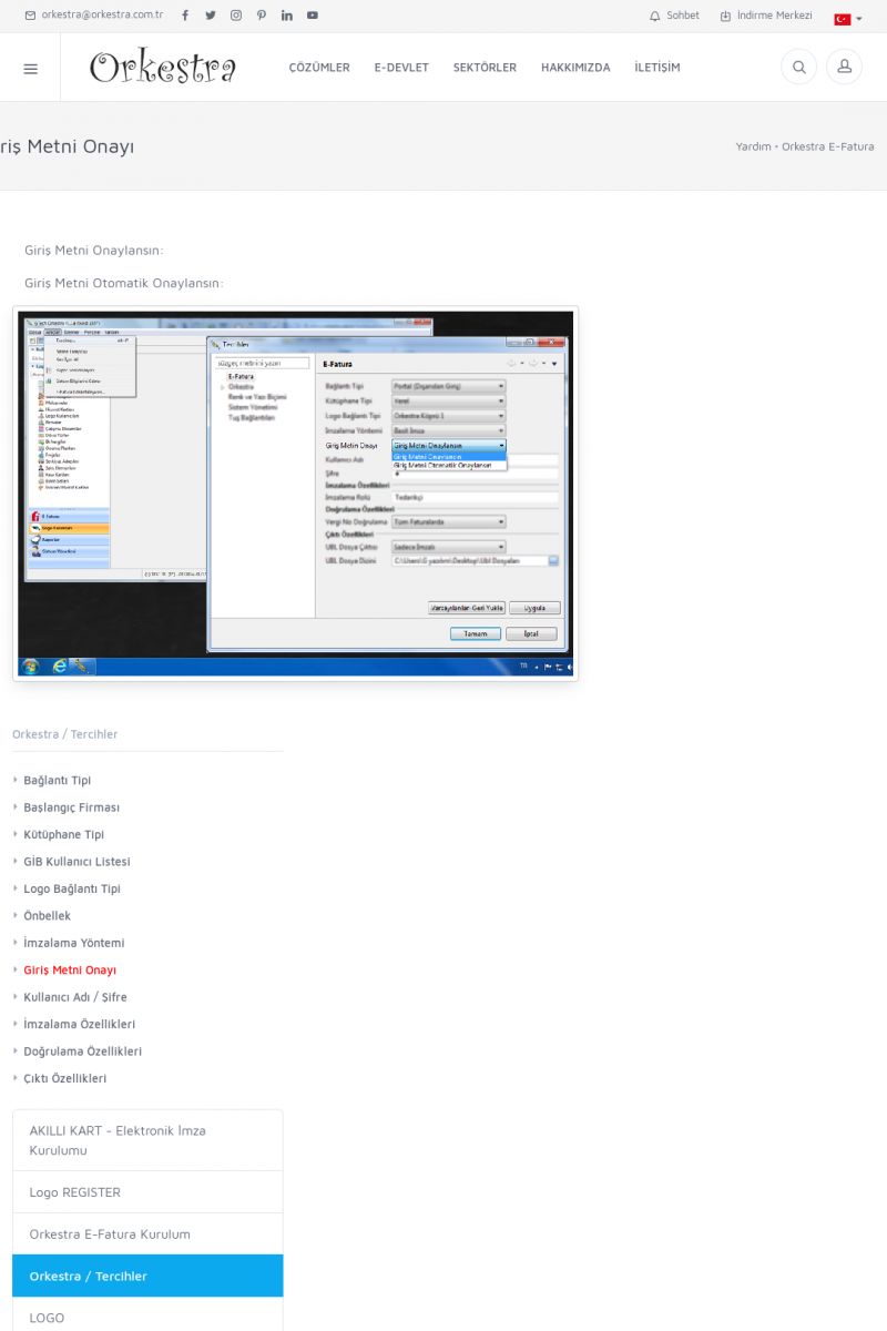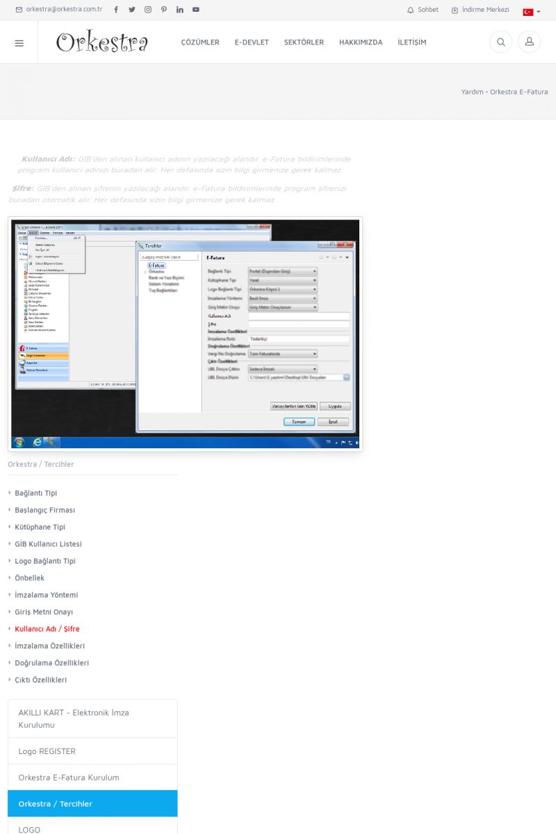 | 89 |  | Orkestra E-FaturaAKILLI KART - ELEKTRONIK İMZA KURULUMU Detay İçin Tıklayınız [/index.php?sayfa=yardim&m=20&y=711] LOGO REGISTER Detay İçin Tıklayınız [/index.php?sayfa=yardim&m=20&y=716] ORKESTRA E-FATURA KURULUM Detay İçin Tıklayınız [/index.php?sayfa=yardim&m=20&y=717] ORKESTRA / TERCIHLER Detay İçin Tıklayınız [/index. KISA ERİŞİM KODU : XYDLS / ARA89 | |