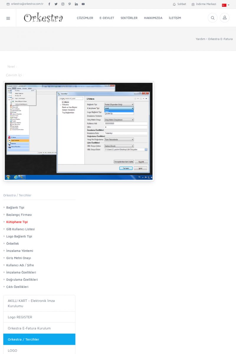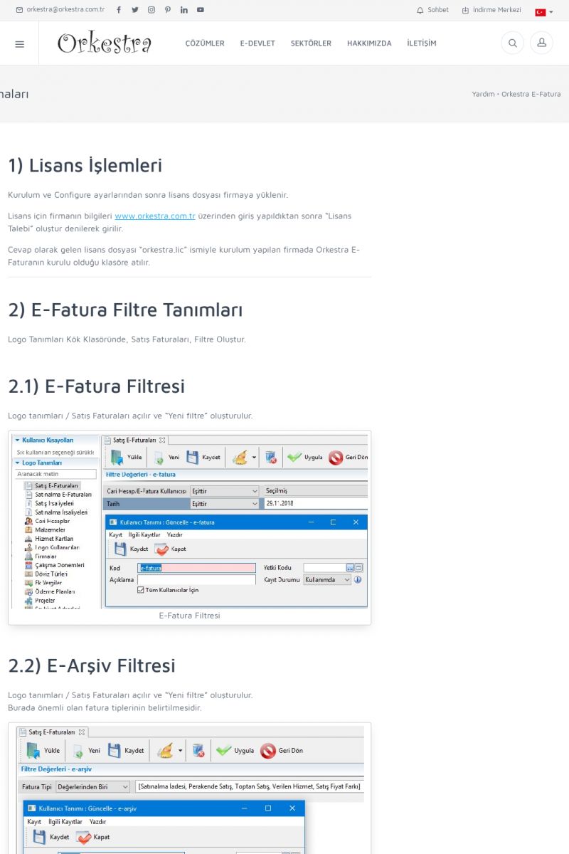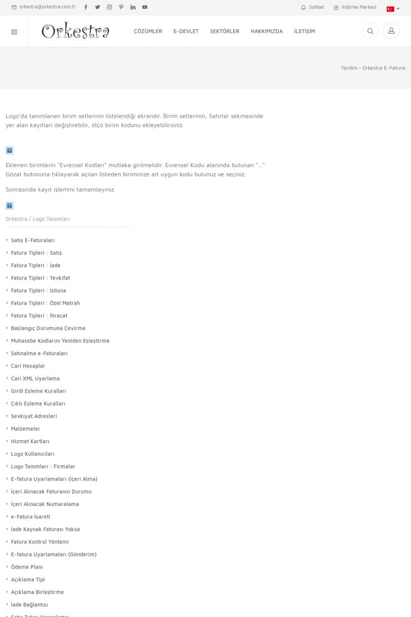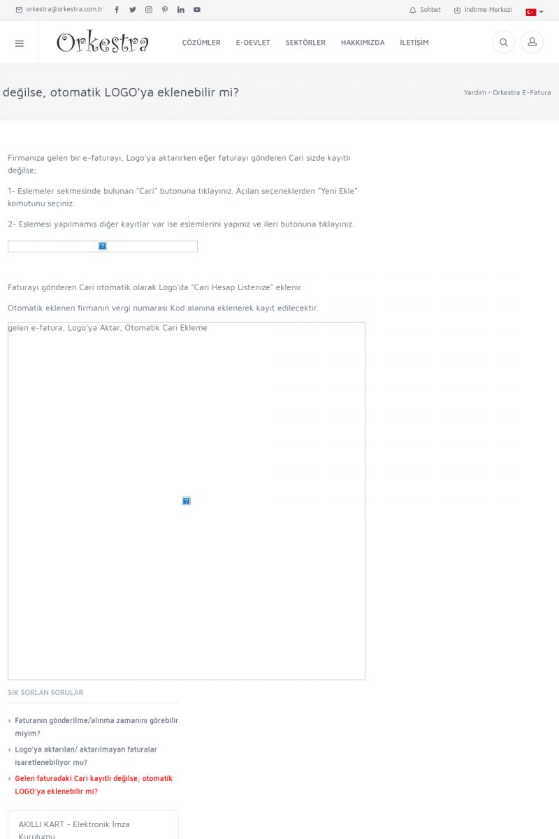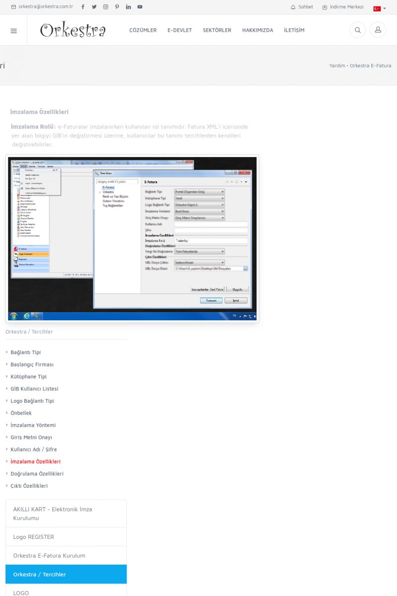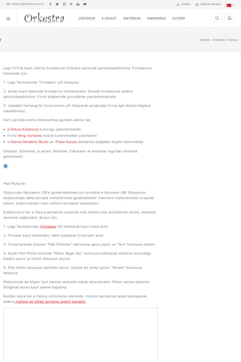 | 89 |  | Orkestra E-FaturaAKILLI KART - ELEKTRONIK İMZA KURULUMU Detay İçin Tıklayınız [/index.php?sayfa=yardim&m=20&y=711] LOGO REGISTER Detay İçin Tıklayınız [/index.php?sayfa=yardim&m=20&y=716] ORKESTRA E-FATURA KURULUM Detay İçin Tıklayınız [/index.php?sayfa=yardim&m=20&y=717] ORKESTRA / TERCIHLER Detay İçin Tıklayınız [/index. KISA ERİŞİM KODU : XYDLS / ARA89 | |