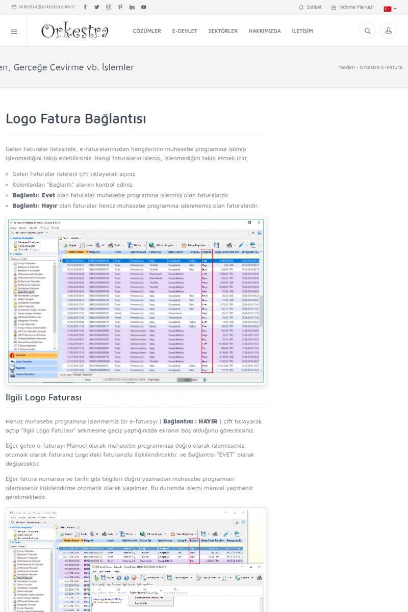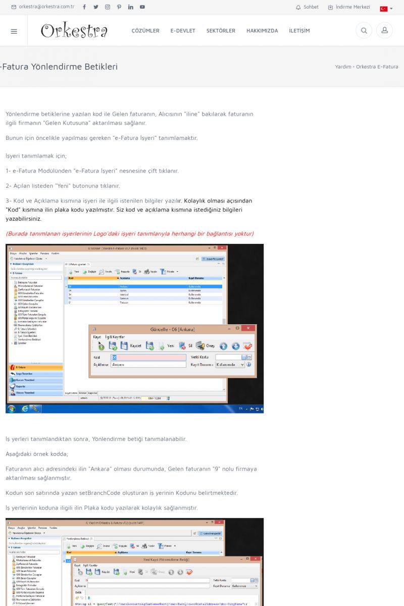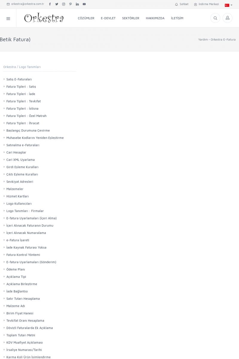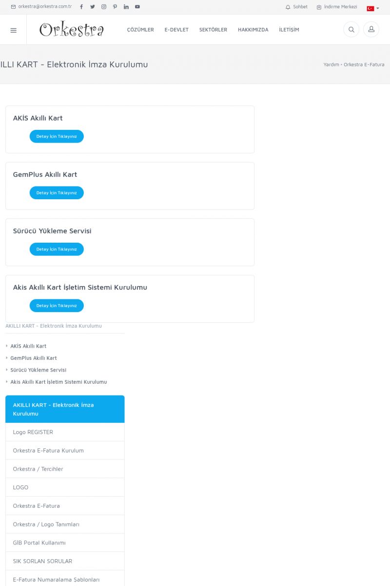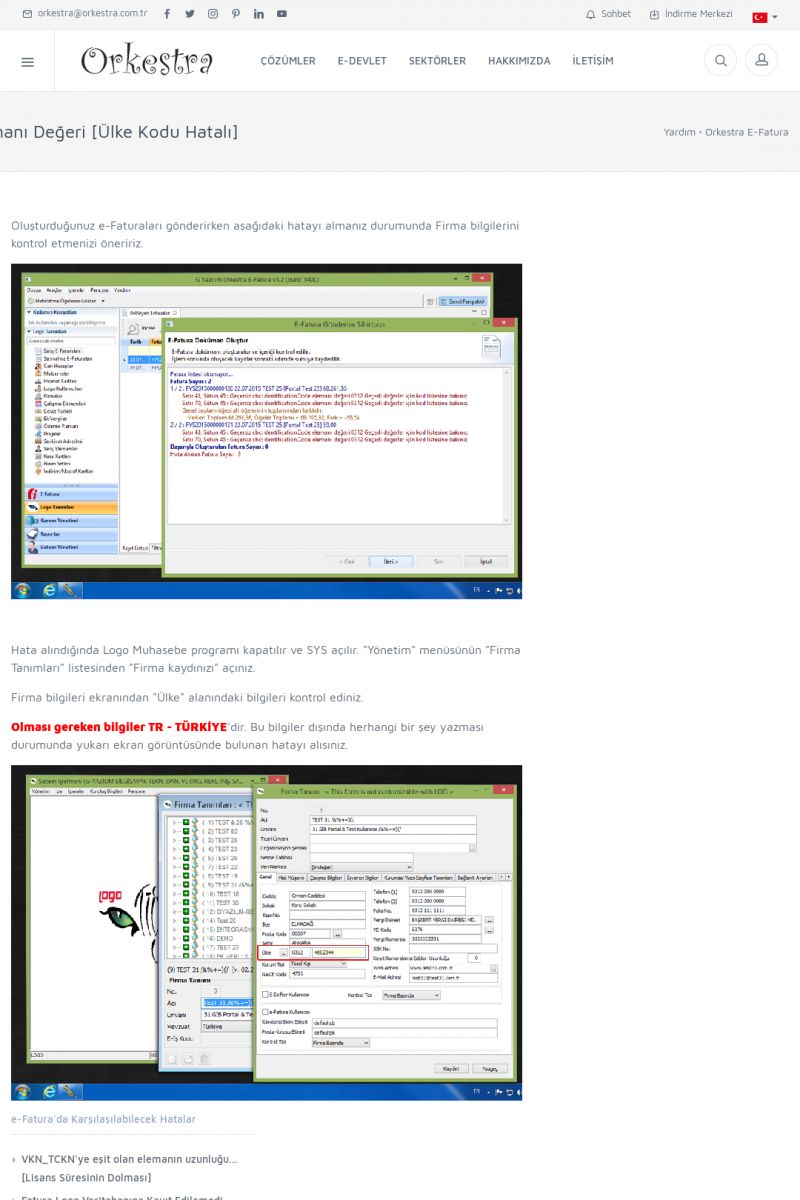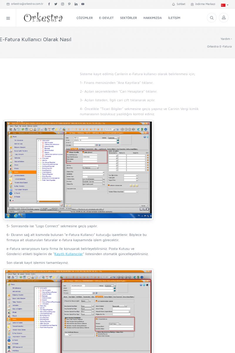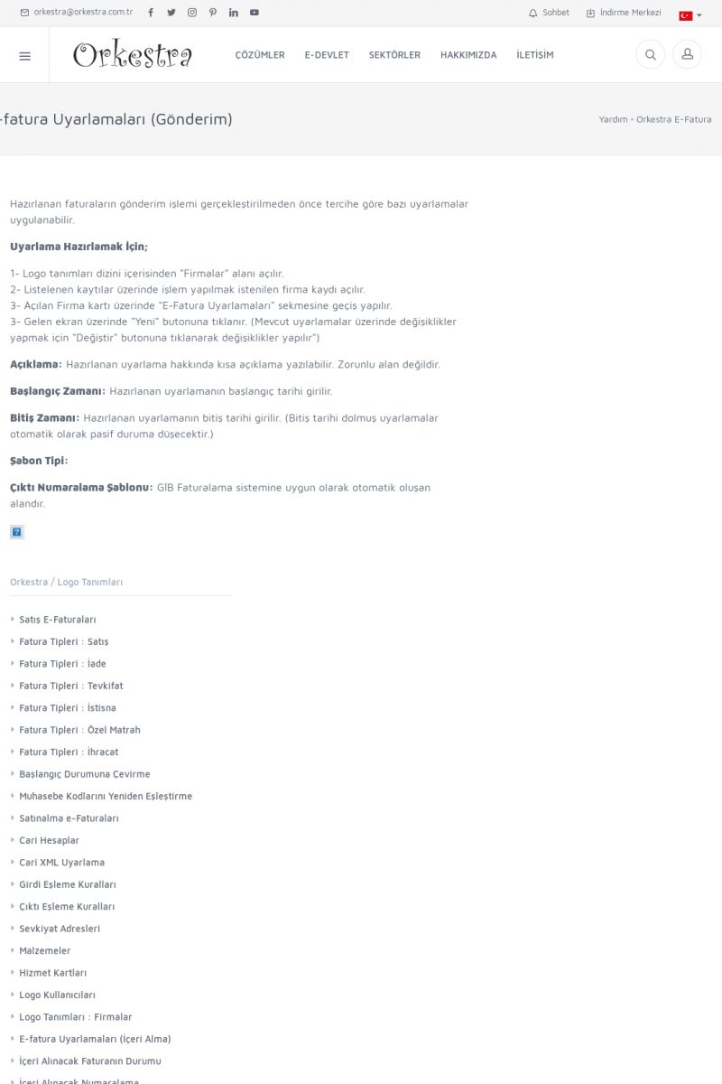 | 89 |  | Orkestra E-FaturaAKILLI KART - ELEKTRONIK İMZA KURULUMU Detay İçin Tıklayınız [/index.php?sayfa=yardim&m=20&y=711] LOGO REGISTER Detay İçin Tıklayınız [/index.php?sayfa=yardim&m=20&y=716] ORKESTRA E-FATURA KURULUM Detay İçin Tıklayınız [/index.php?sayfa=yardim&m=20&y=717] ORKESTRA / TERCIHLER Detay İçin Tıklayınız [/index. KISA ERİŞİM KODU : XYDLS / ARA89 | |