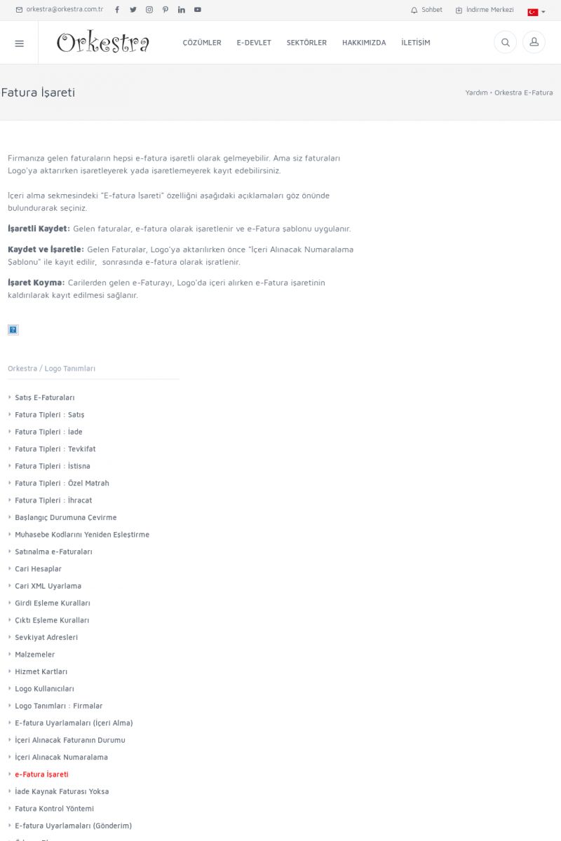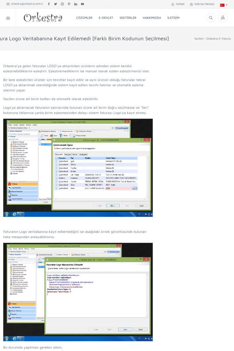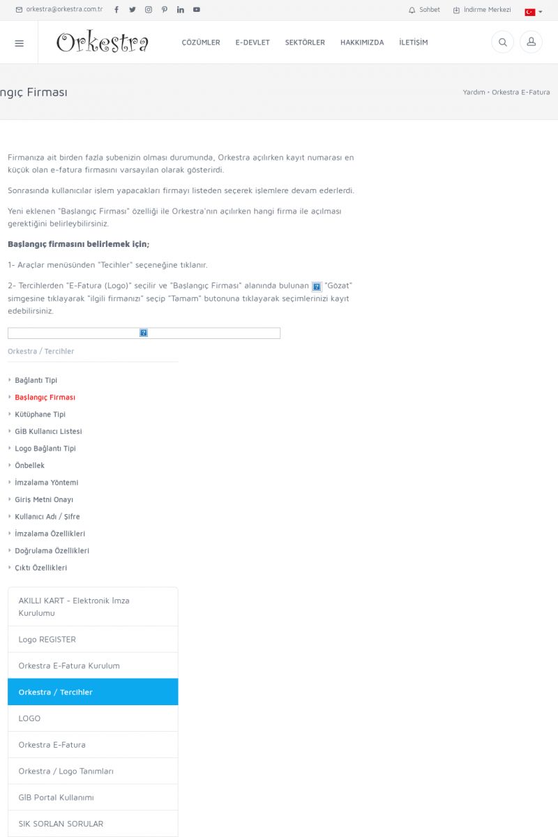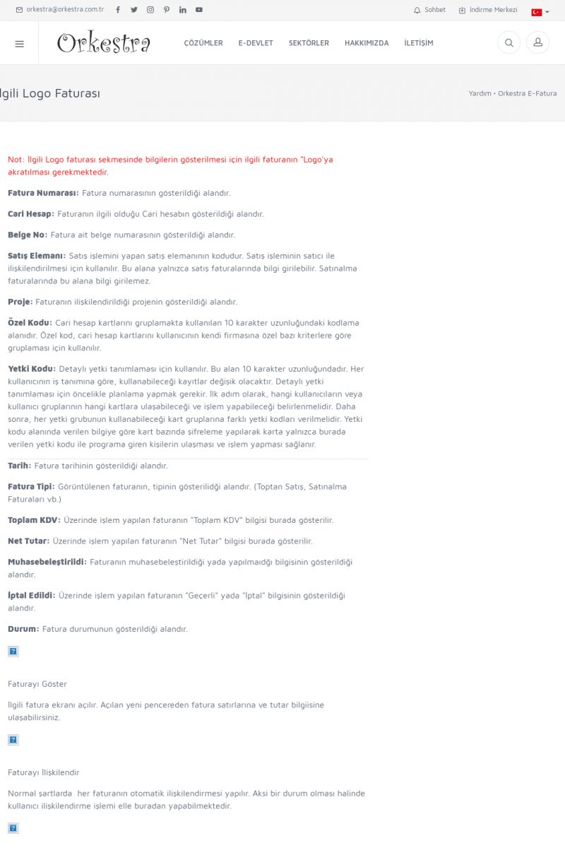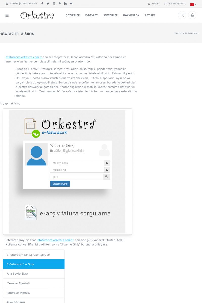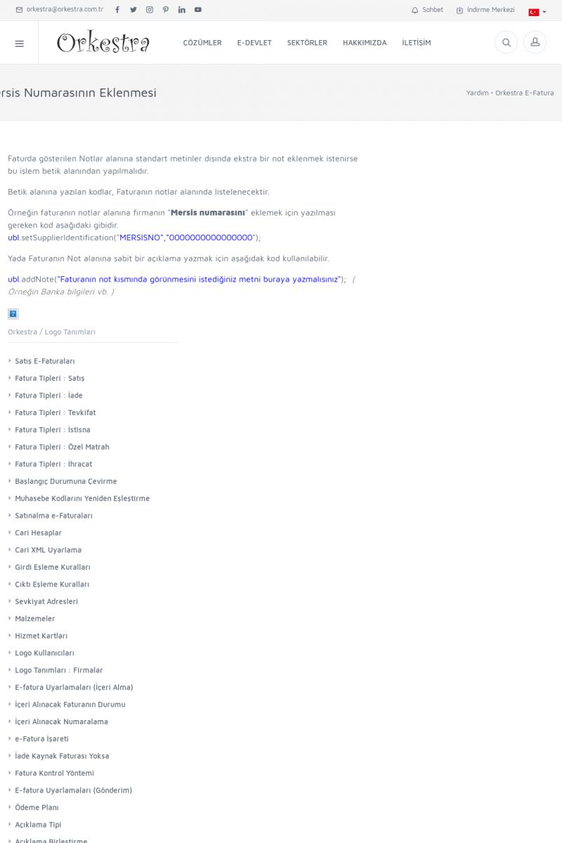 | 89 |  | Orkestra E-FaturaAKILLI KART - ELEKTRONIK İMZA KURULUMU Detay İçin Tıklayınız [/index.php?sayfa=yardim&m=20&y=711] LOGO REGISTER Detay İçin Tıklayınız [/index.php?sayfa=yardim&m=20&y=716] ORKESTRA E-FATURA KURULUM Detay İçin Tıklayınız [/index.php?sayfa=yardim&m=20&y=717] ORKESTRA / TERCIHLER Detay İçin Tıklayınız [/index. KISA ERİŞİM KODU : XYDLS / ARA89 | |
