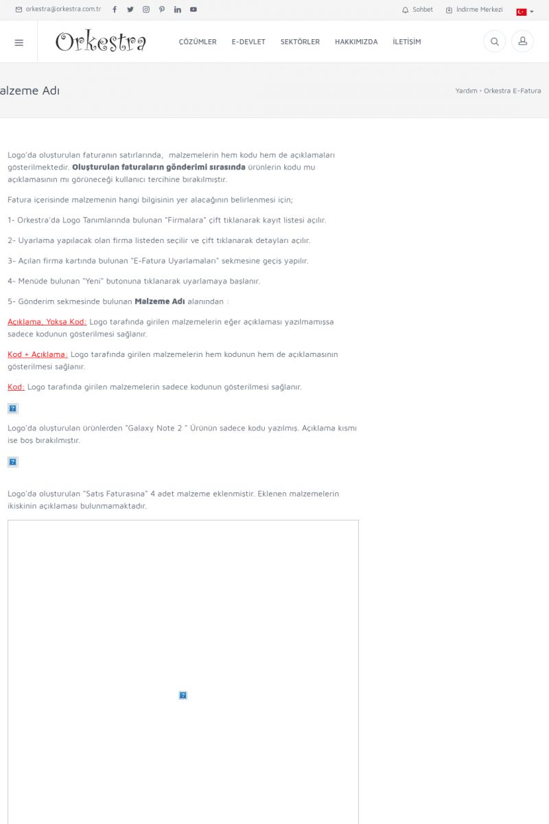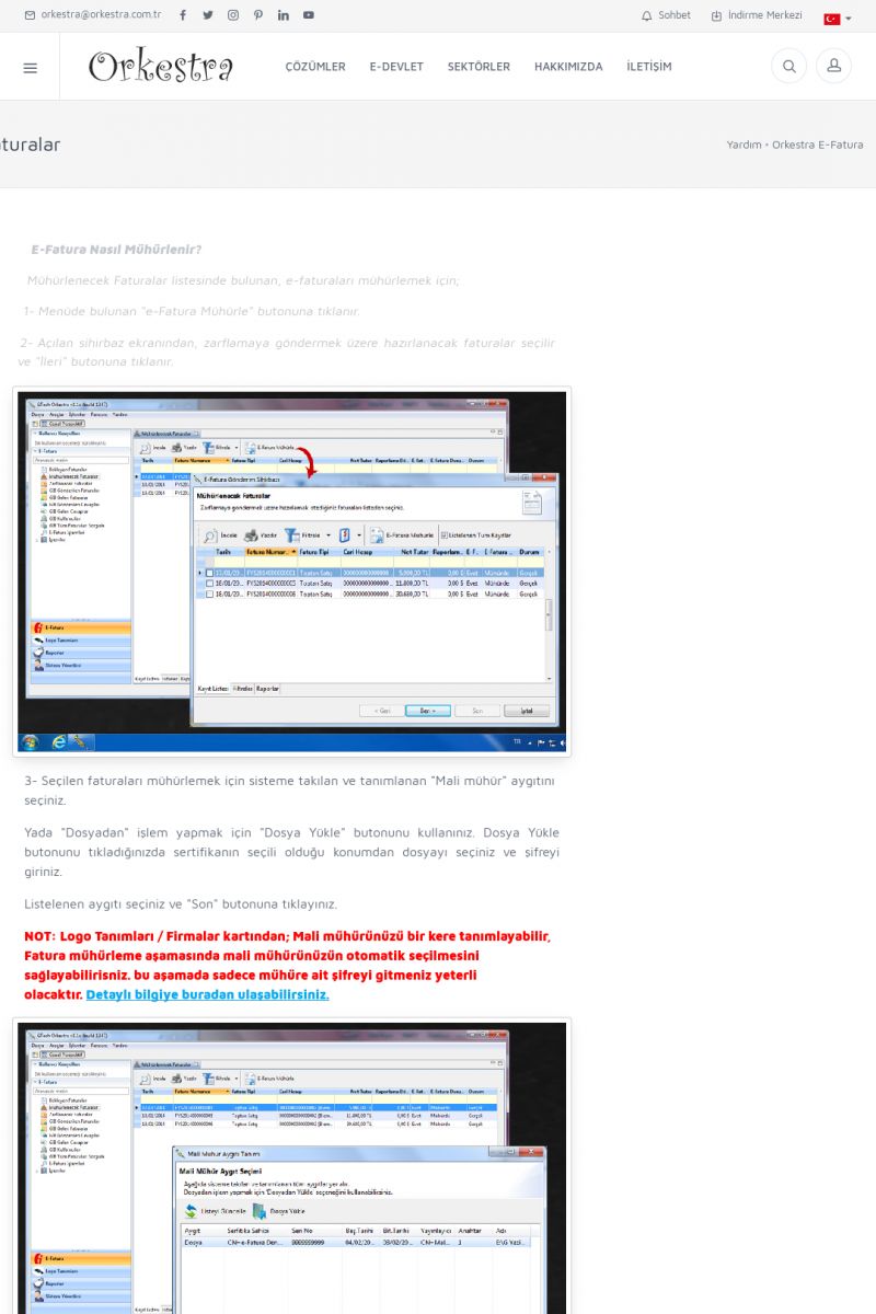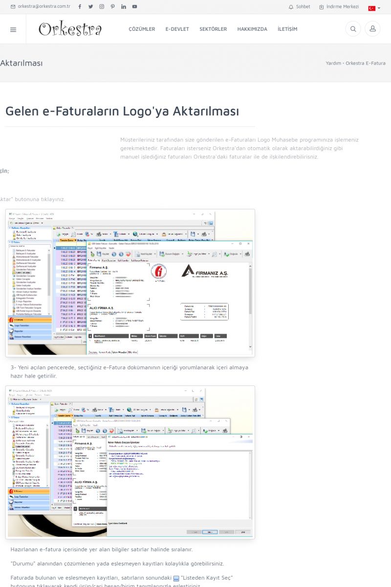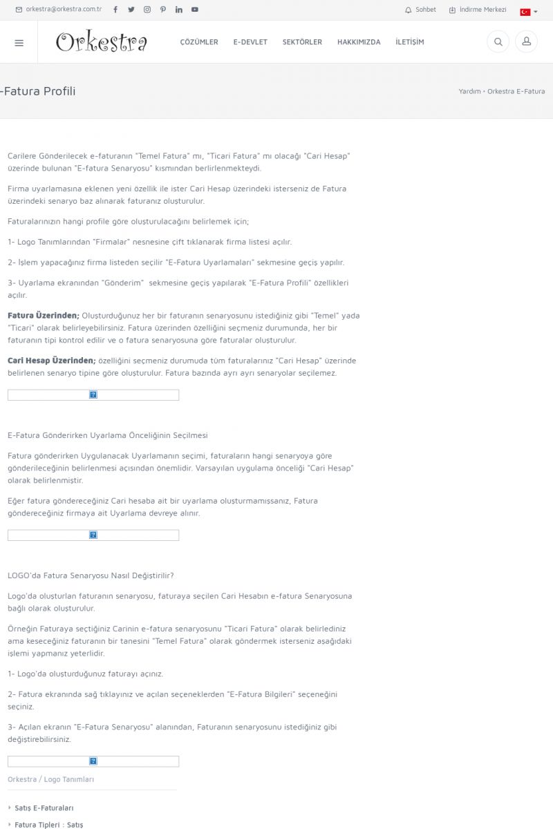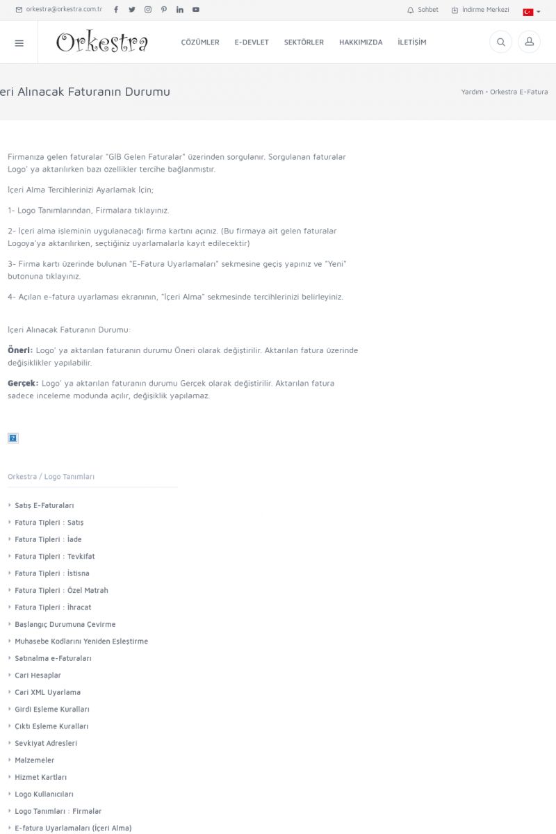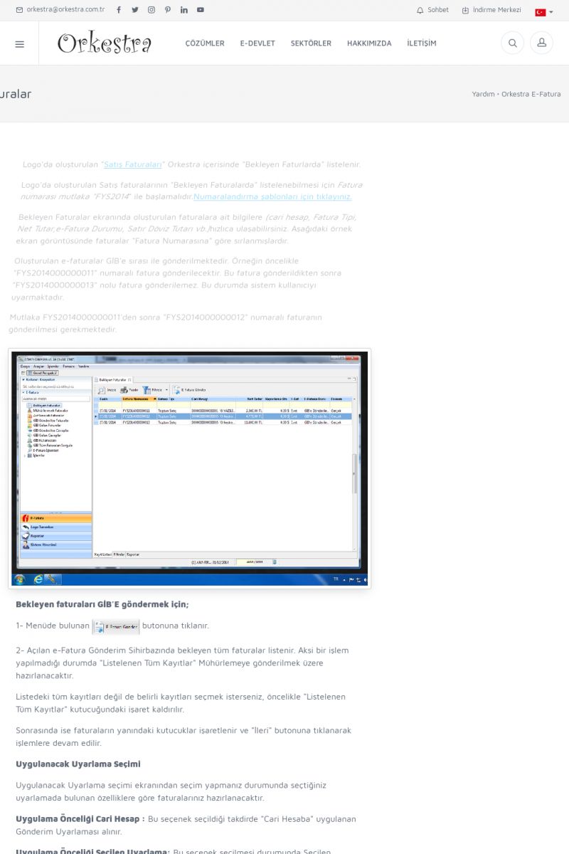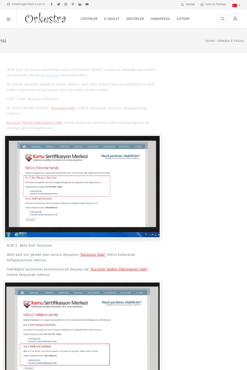 | 89 |  | Orkestra E-FaturaAKILLI KART - ELEKTRONIK İMZA KURULUMU Detay İçin Tıklayınız [/index.php?sayfa=yardim&m=20&y=711] LOGO REGISTER Detay İçin Tıklayınız [/index.php?sayfa=yardim&m=20&y=716] ORKESTRA E-FATURA KURULUM Detay İçin Tıklayınız [/index.php?sayfa=yardim&m=20&y=717] ORKESTRA / TERCIHLER Detay İçin Tıklayınız [/index. KISA ERİŞİM KODU : XYDLS / ARA89 | |