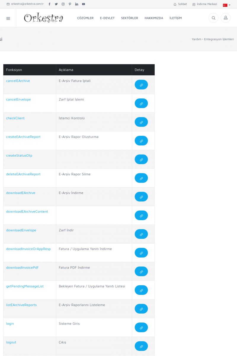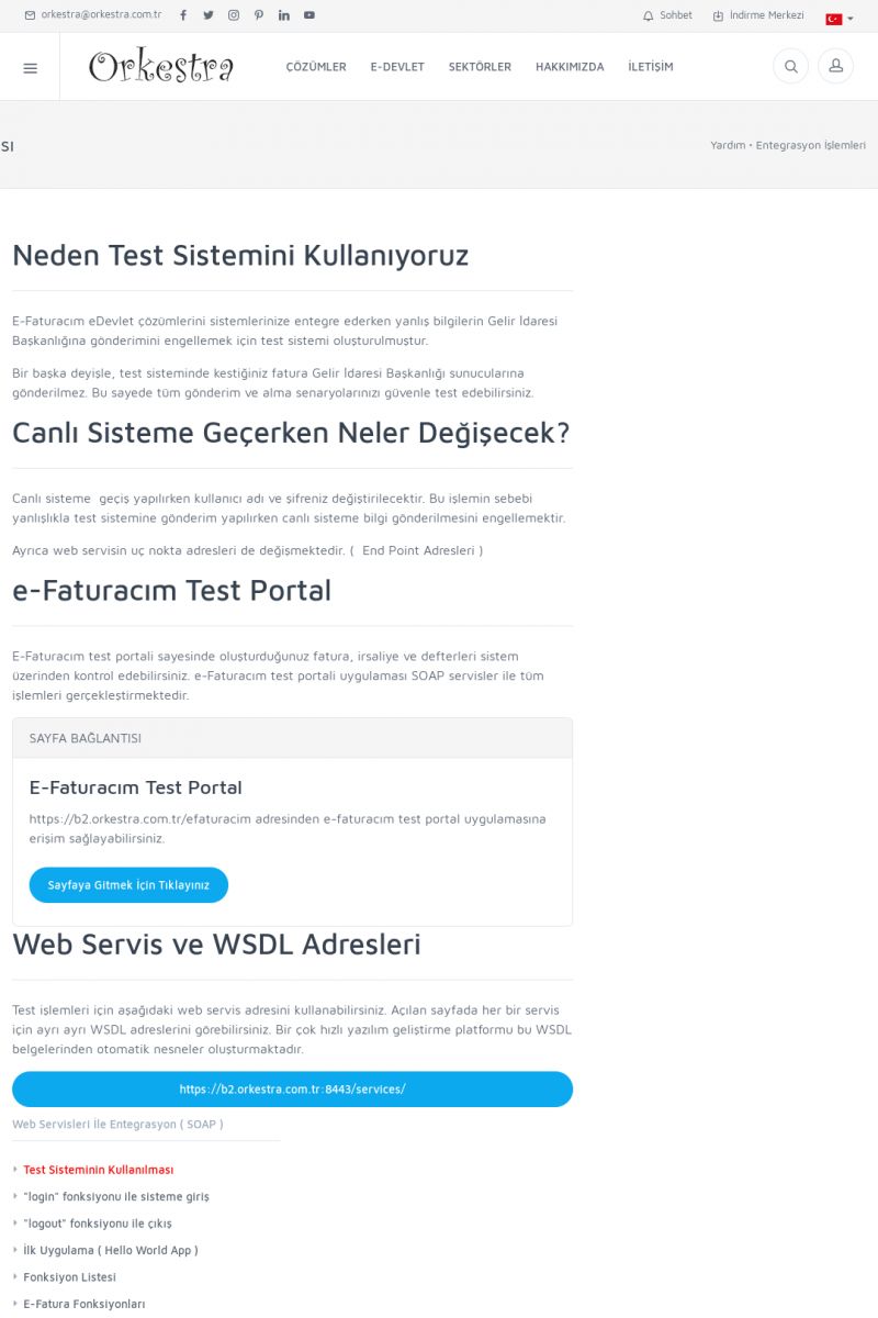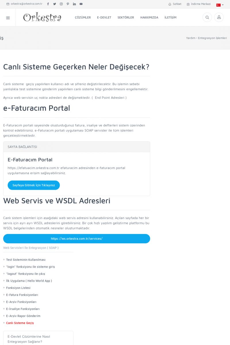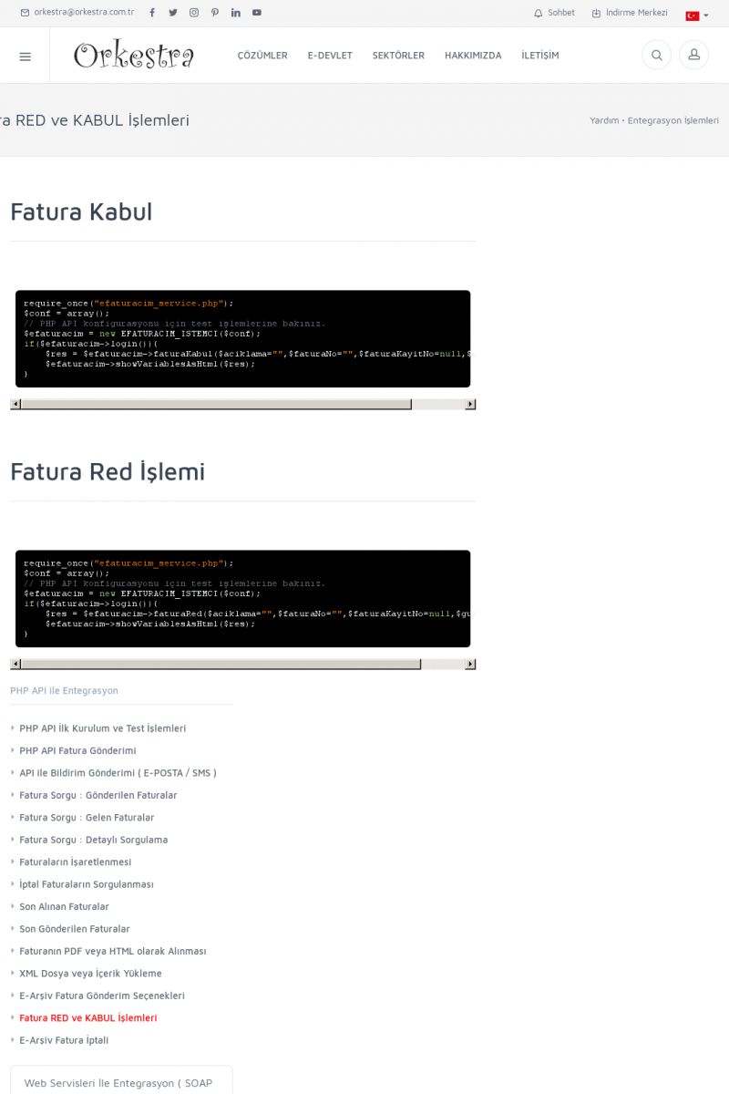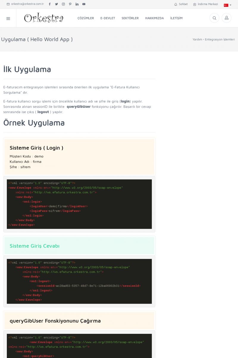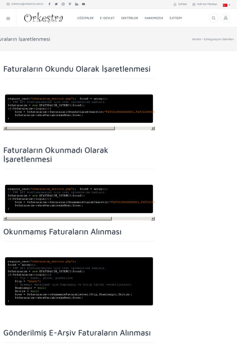 | 94 |  | Entegrasyon İşlemleriE-DEVLET ÇÖZÜMLERINE NASIL ENTEGRASYON SAĞLANIR? Orkestra E-faturacım (efaturacim.com) E-Devlet çözümlerine çeşitli teknolojiler ile entegrasyon sağlayabilirsiniz. Entegrasyon işlemlerinin detayı için lütfen bu sayfayı ziyaret ediniz. Detay İçin Tıklayınız [/index. KISA ERİŞİM KODU : XYDQO / ARA94 | |