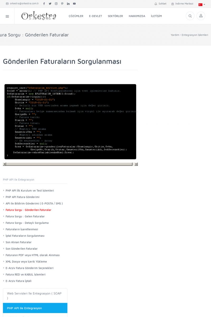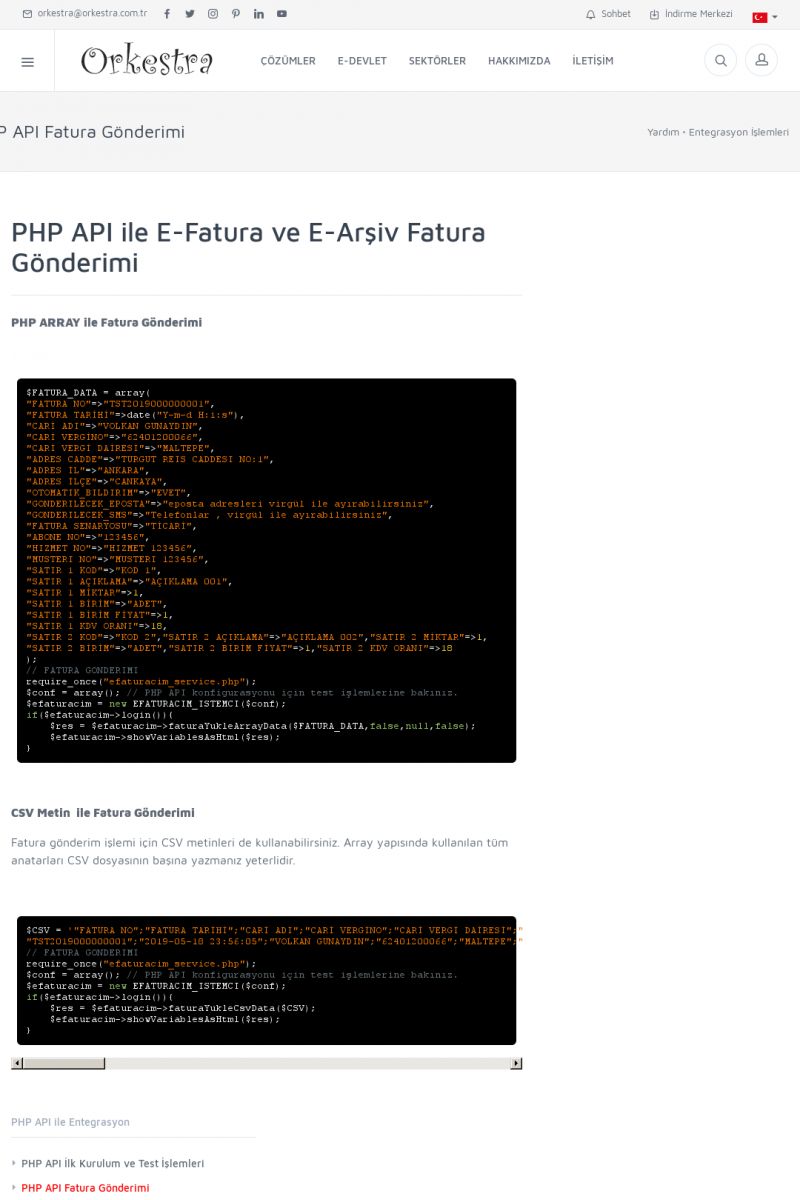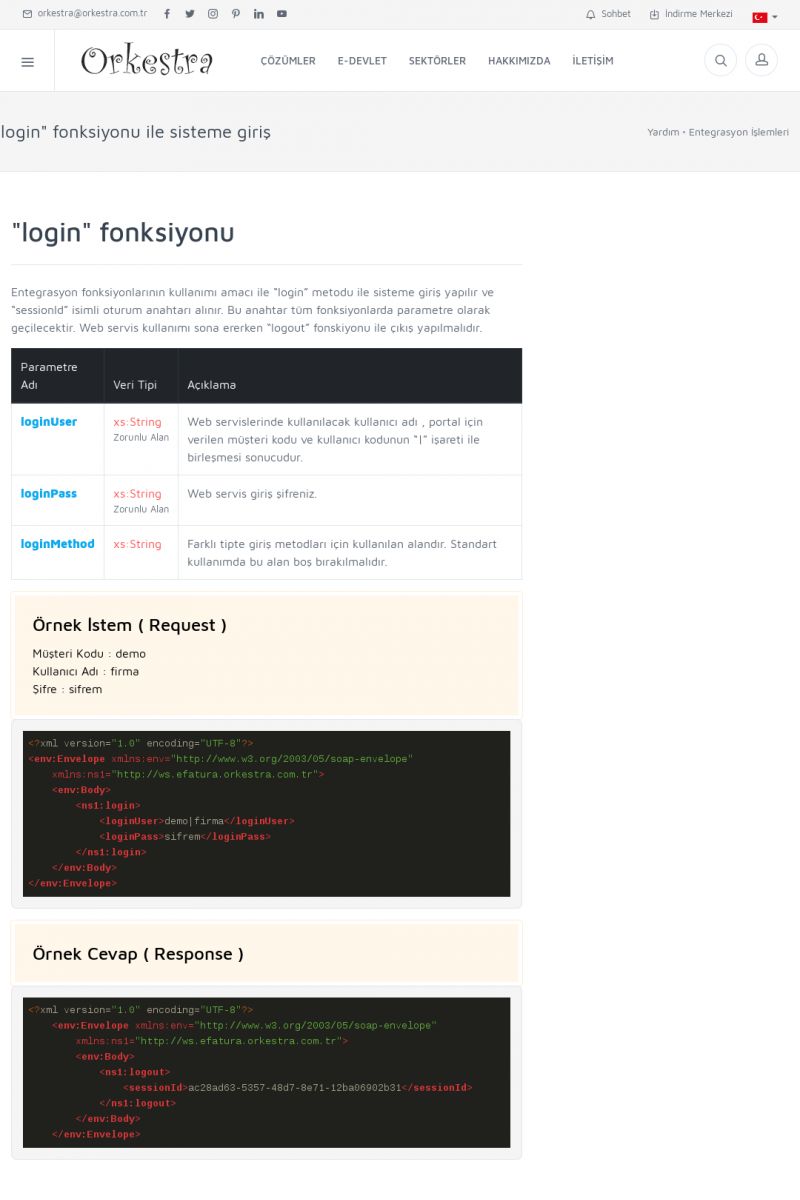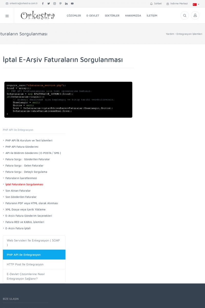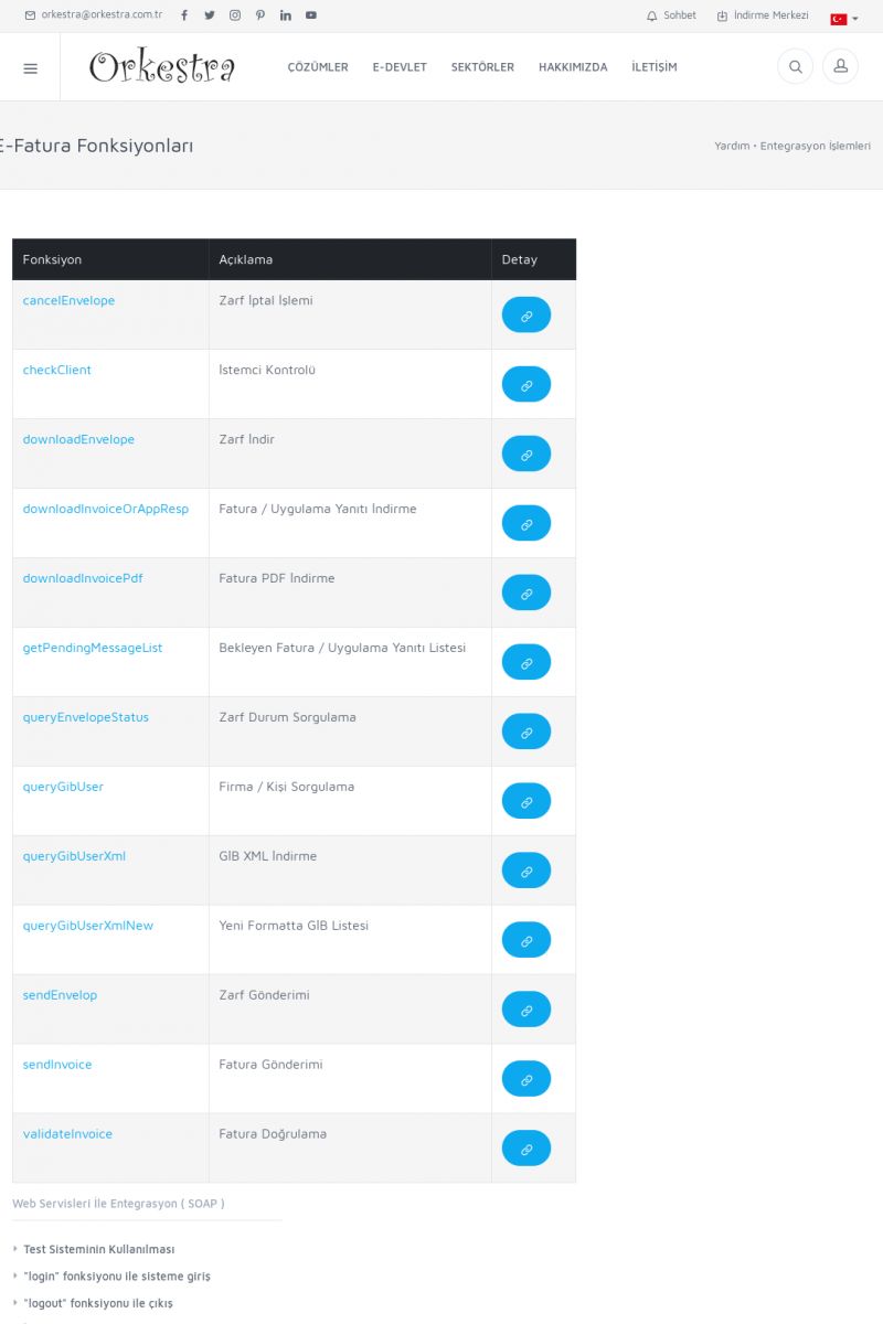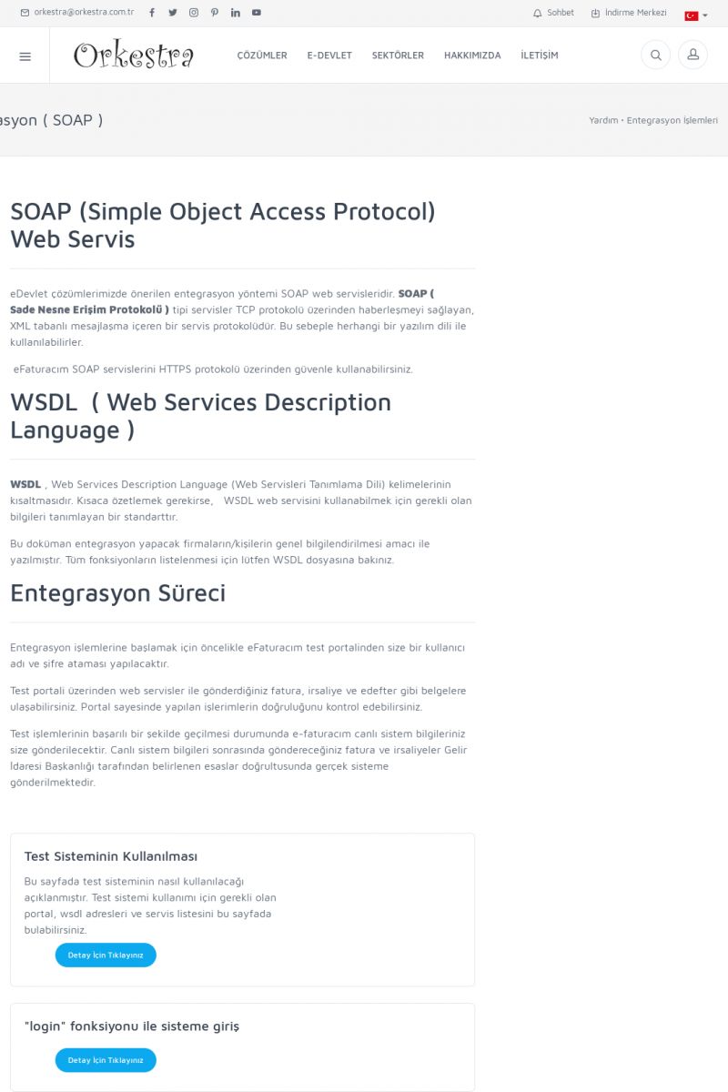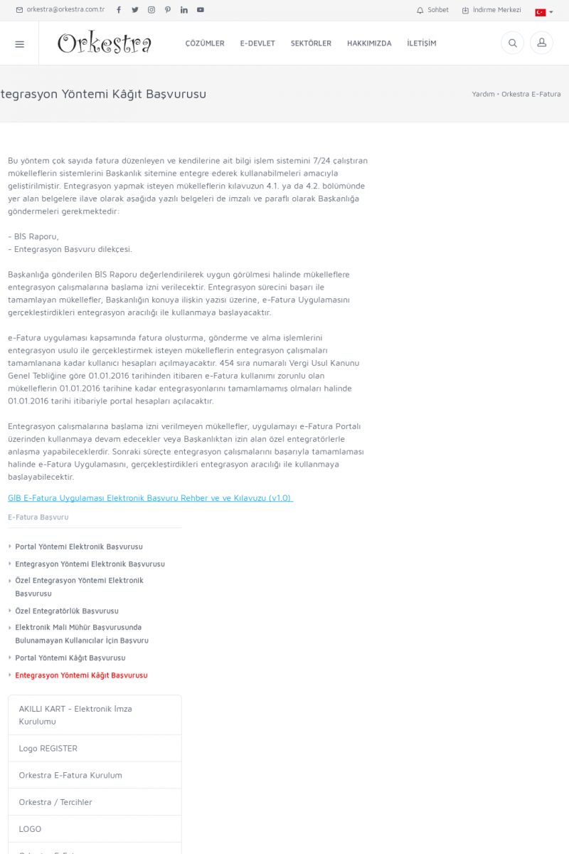 | 94 |  | Entegrasyon İşlemleriE-DEVLET ÇÖZÜMLERINE NASIL ENTEGRASYON SAĞLANIR? Orkestra E-faturacım (efaturacim.com) E-Devlet çözümlerine çeşitli teknolojiler ile entegrasyon sağlayabilirsiniz. Entegrasyon işlemlerinin detayı için lütfen bu sayfayı ziyaret ediniz. Detay İçin Tıklayınız [/index. KISA ERİŞİM KODU : XYDQO / ARA94 | |