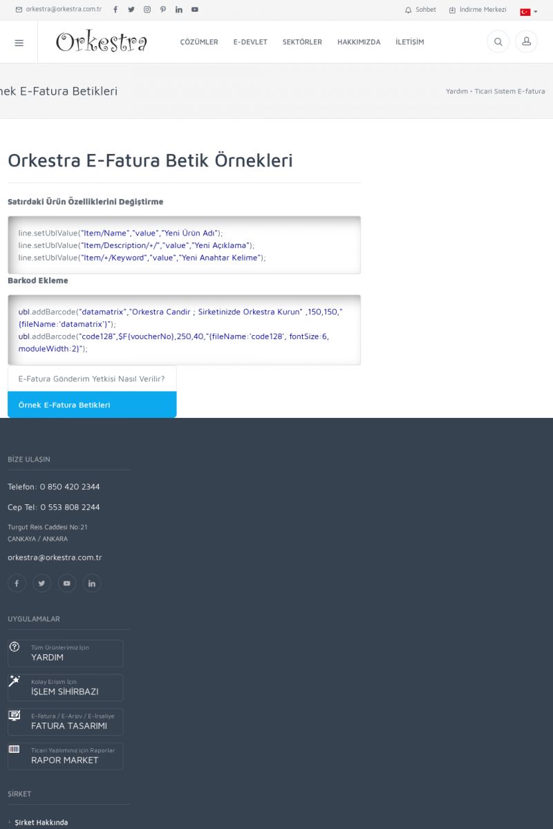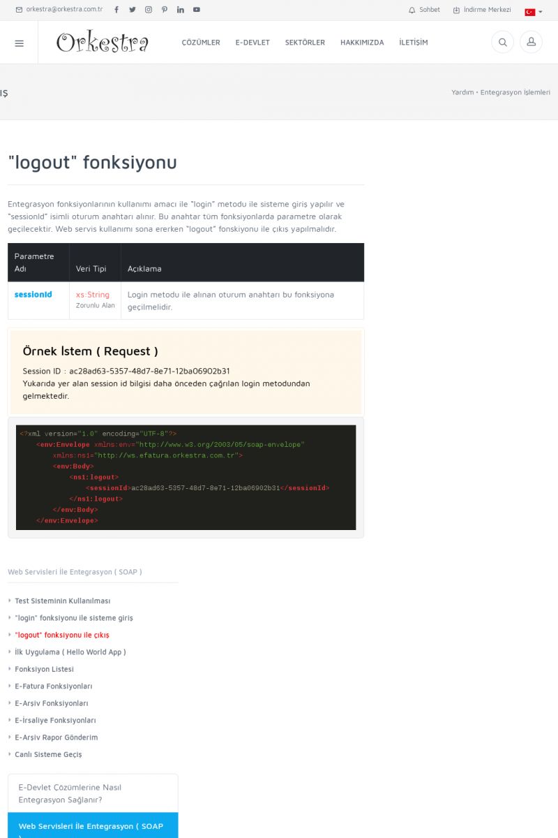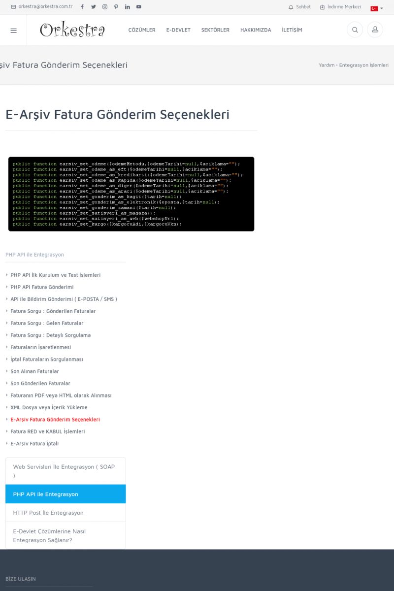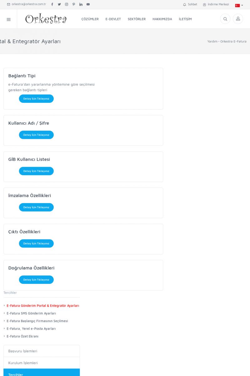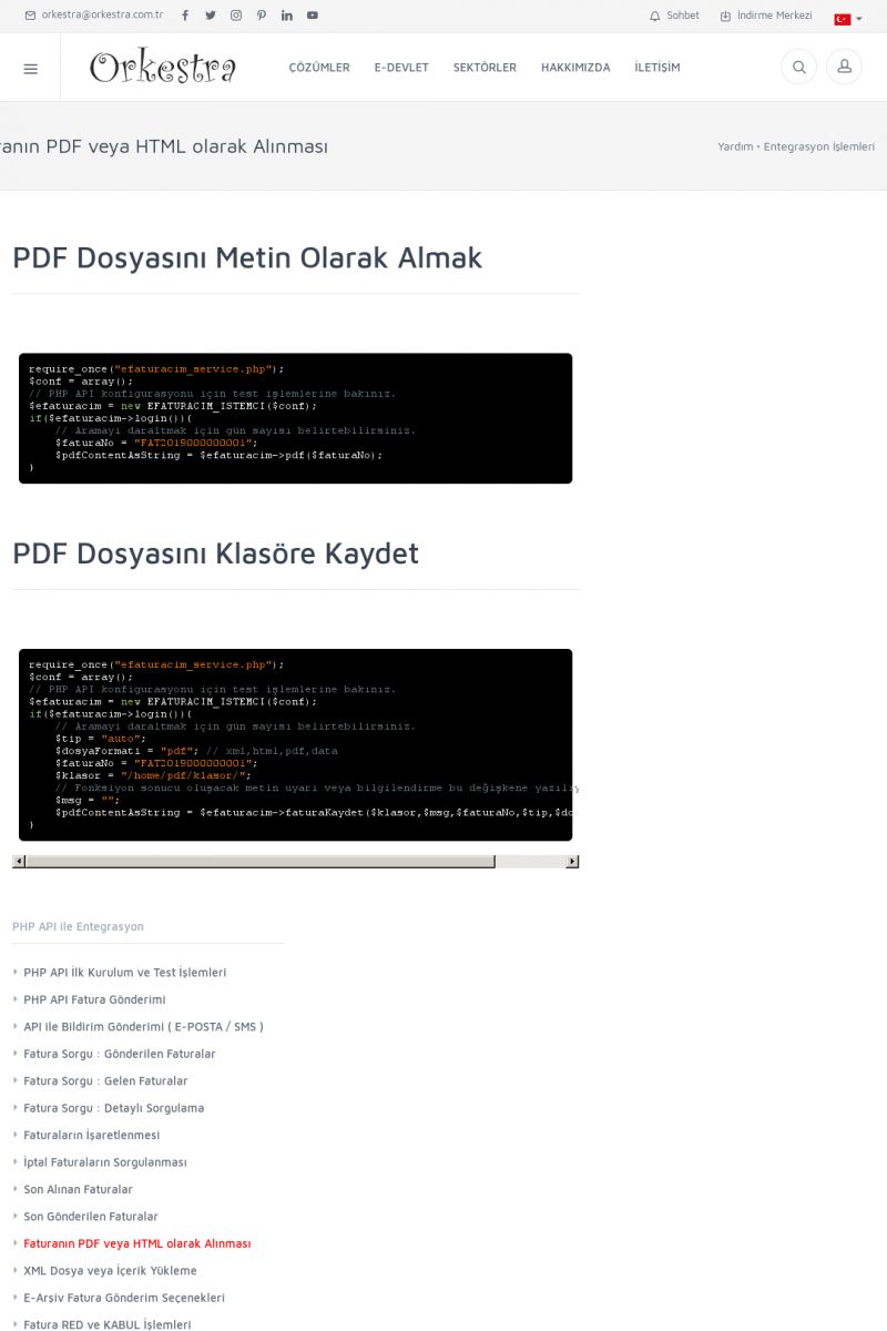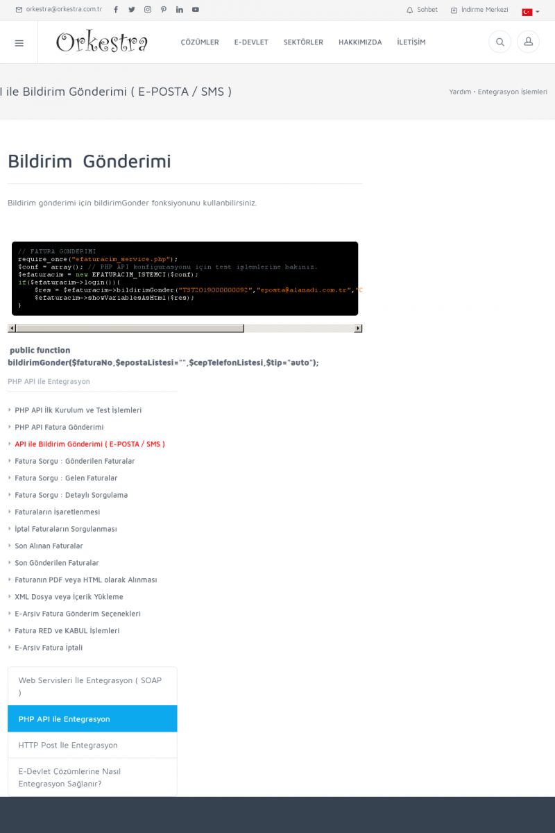 | 94 |  | Entegrasyon İşlemleriE-DEVLET ÇÖZÜMLERINE NASIL ENTEGRASYON SAĞLANIR? Orkestra E-faturacım (efaturacim.com) E-Devlet çözümlerine çeşitli teknolojiler ile entegrasyon sağlayabilirsiniz. Entegrasyon işlemlerinin detayı için lütfen bu sayfayı ziyaret ediniz. Detay İçin Tıklayınız [/index. KISA ERİŞİM KODU : XYDQO / ARA94 | |