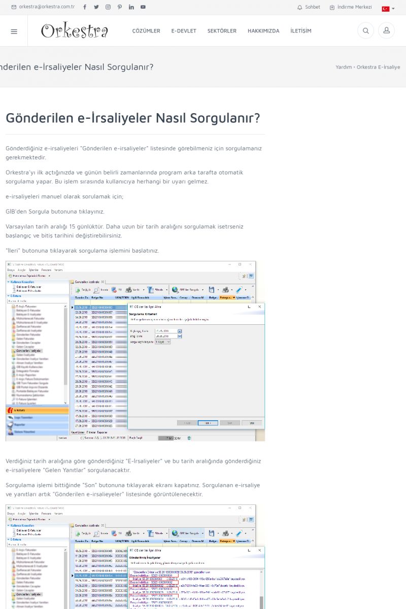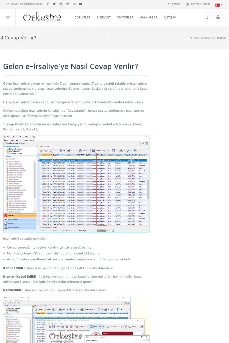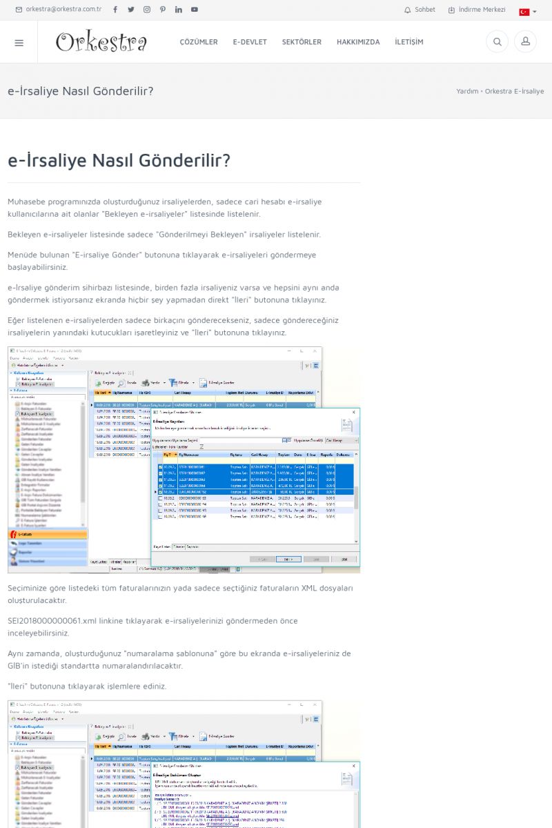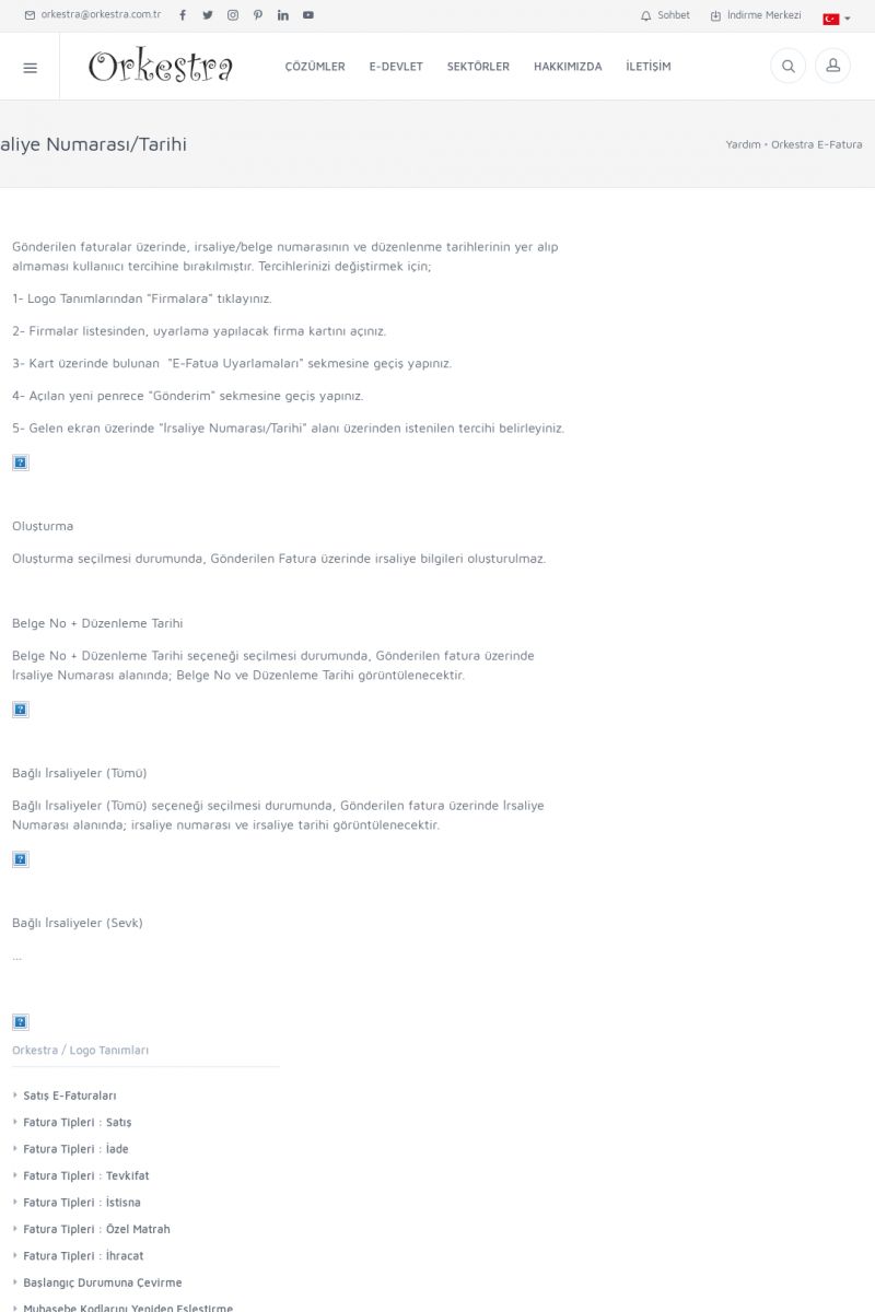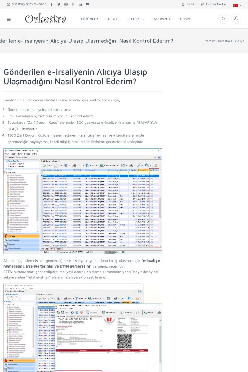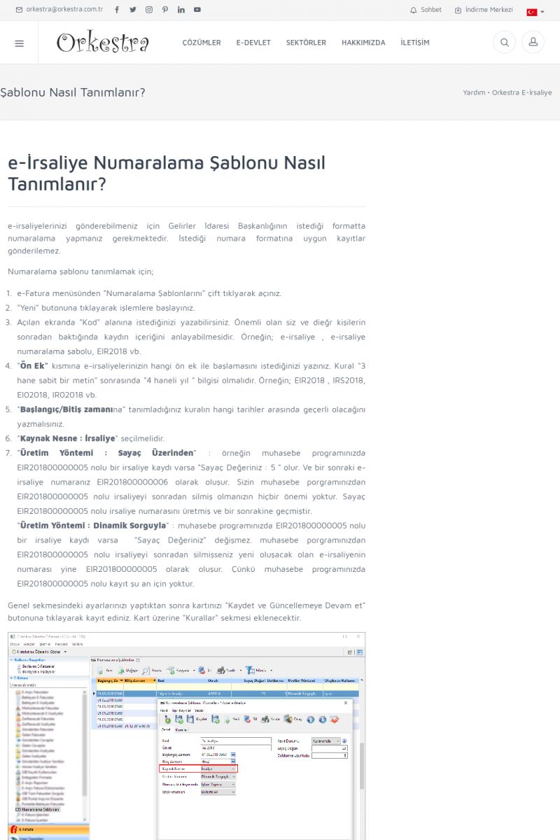 | 1826 |  | e-İrsaliye Gönderimi ile İlgili Her ŞeyE-İRSALIYE SISTEM AYARLARI Detay İçin Tıklayınız [/index.php?sayfa=yardim&m=53&y=1752&y2=1793] ORKESTRA, OLUŞTURULAN IRSALIYELERI E-İRSALIYE OLARAK NASIL AYARLAR? Detay İçin Tıklayınız [/index.php?sayfa=yardim&m=53&y=1752&y2=1766] E-İRSALIYE NASIL GÖNDERILIR ? Detay İçin Tıklayınız [/index. KISA ERİŞİM KODU : XYCSHT / ARA1827 | |