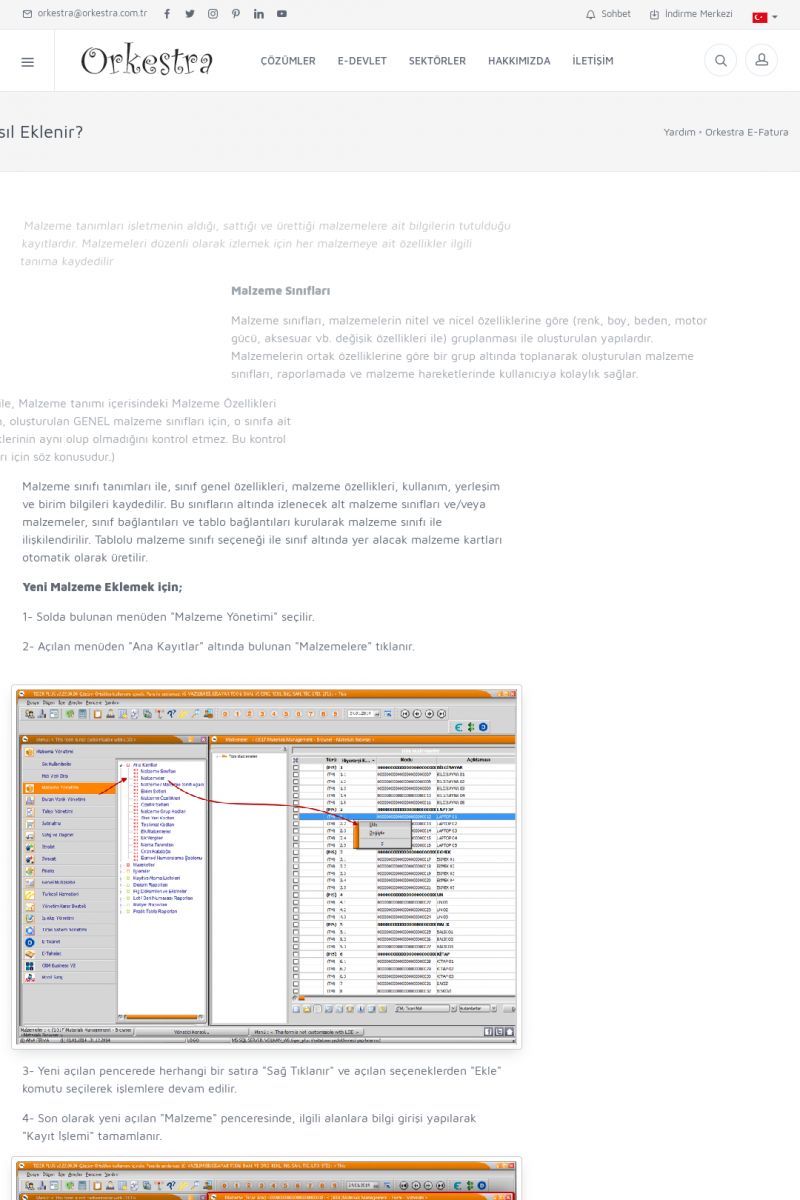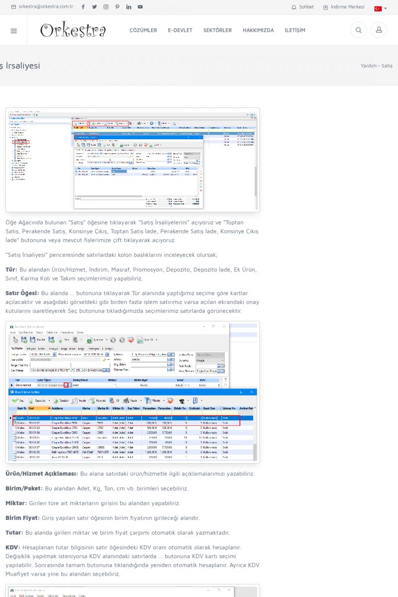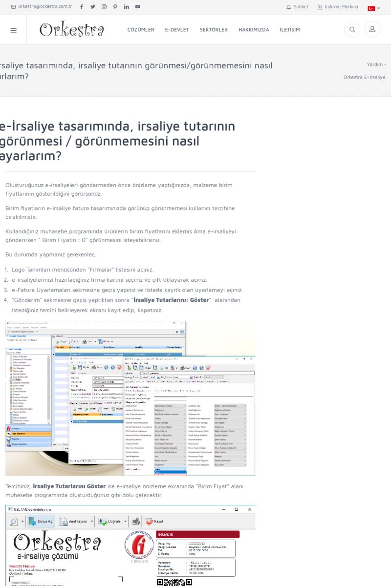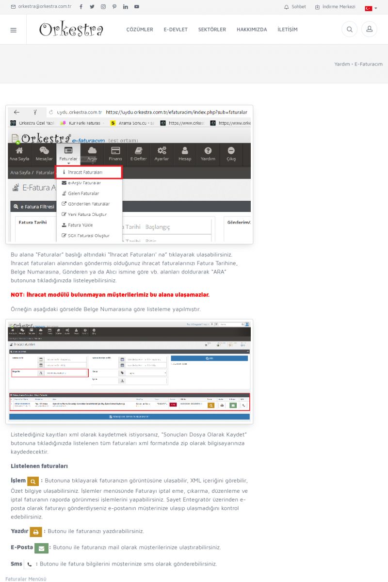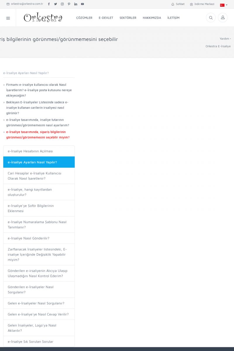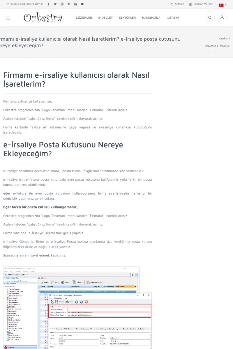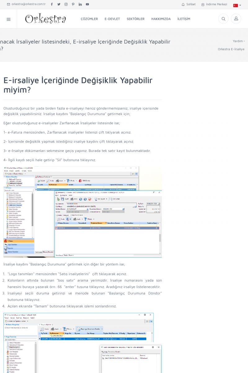 | 1826 |  | e-İrsaliye Gönderimi ile İlgili Her ŞeyE-İRSALIYE SISTEM AYARLARI Detay İçin Tıklayınız [/index.php?sayfa=yardim&m=53&y=1752&y2=1793] ORKESTRA, OLUŞTURULAN IRSALIYELERI E-İRSALIYE OLARAK NASIL AYARLAR? Detay İçin Tıklayınız [/index.php?sayfa=yardim&m=53&y=1752&y2=1766] E-İRSALIYE NASIL GÖNDERILIR ? Detay İçin Tıklayınız [/index. KISA ERİŞİM KODU : XYCSHT / ARA1827 | |