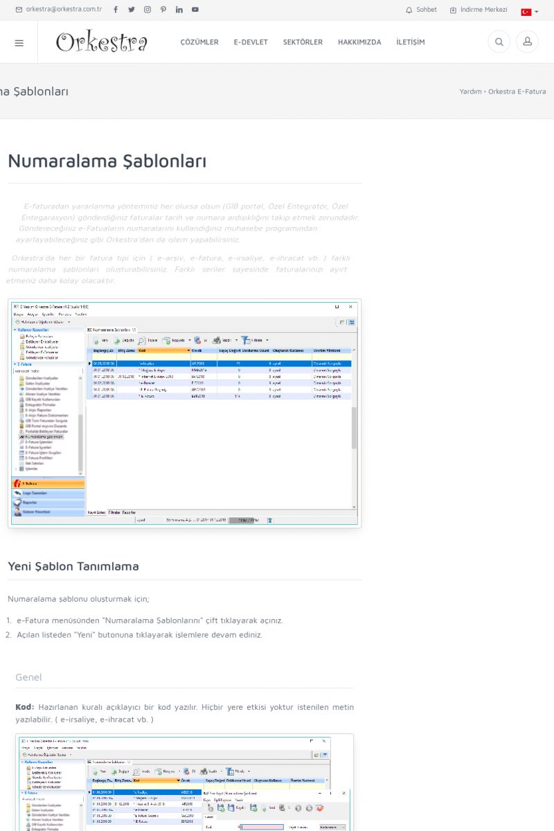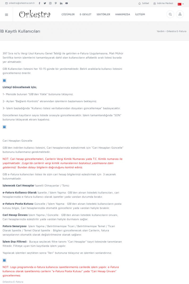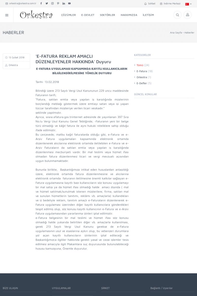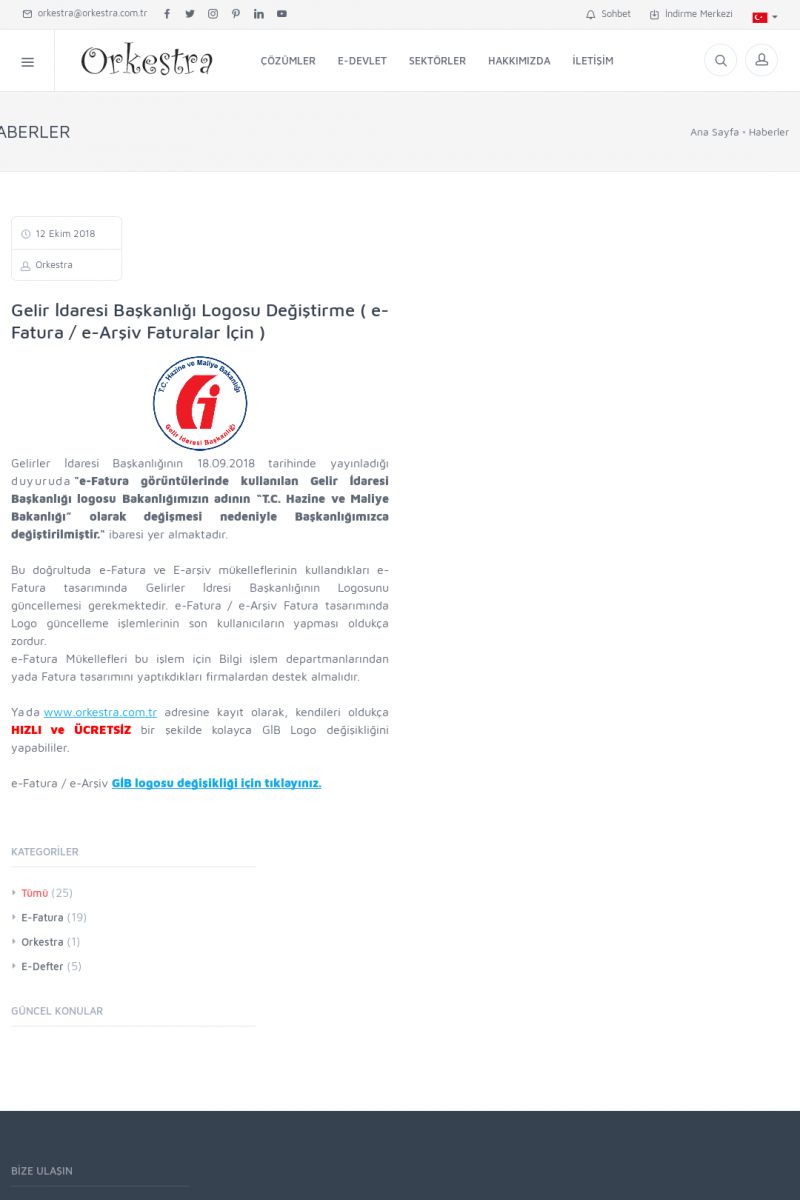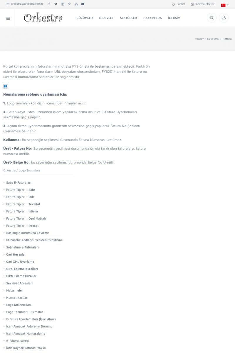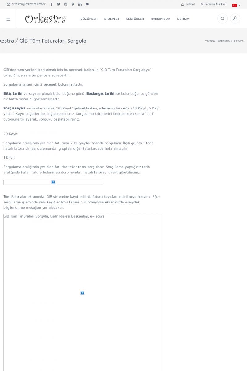 | 20 |  | Haberler / Güncel KonularBu sayfa içerisinde güncel konuları ve haberleri bulabilirsiniz. E-Fatura, E-Defter, E-Arşiv ve Orkestra Ticari Sistem ile ilgili yenilikleri buradan takip edebilirsiniz. KISA ERİŞİM KODU : XYUD / ARA20 | |