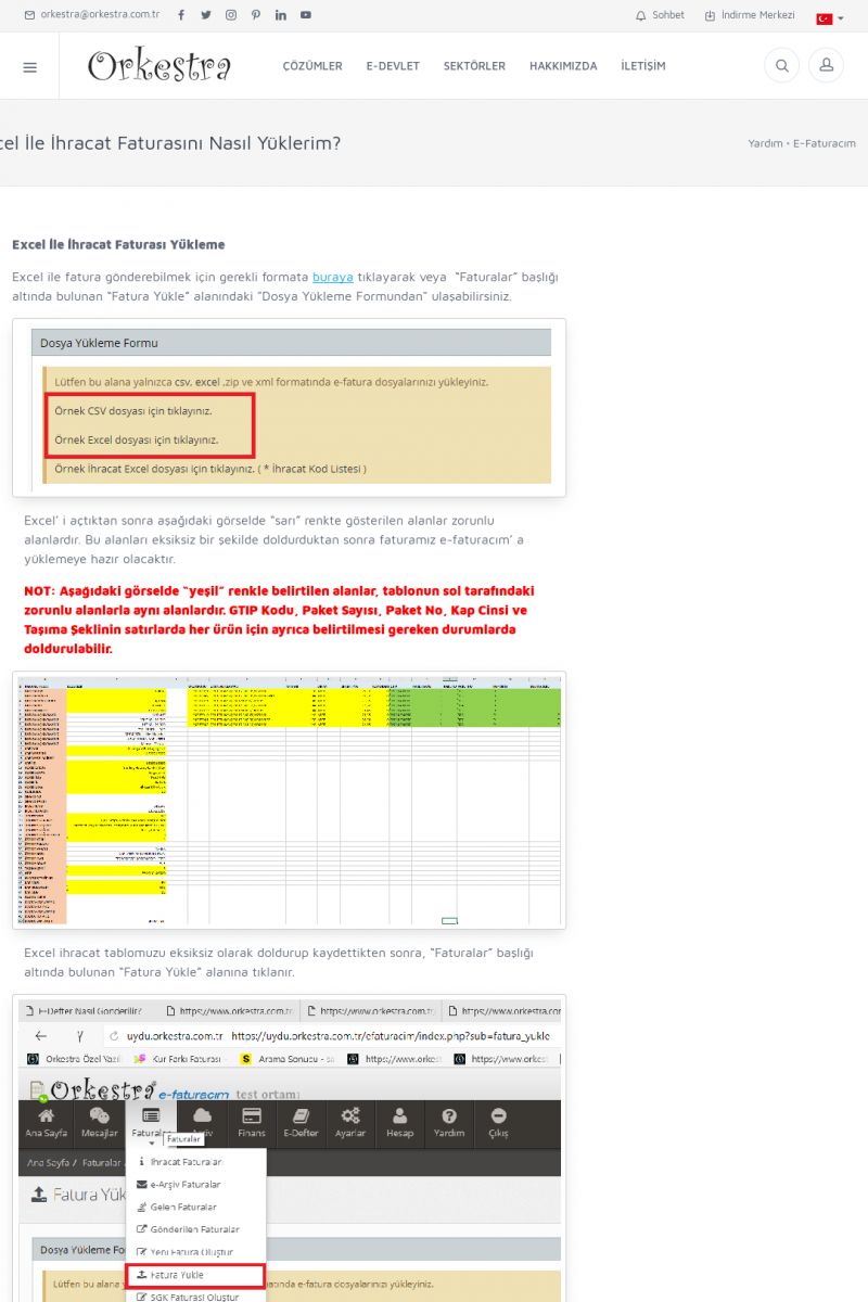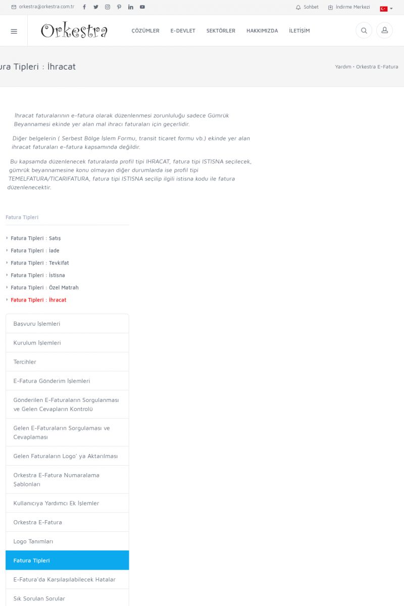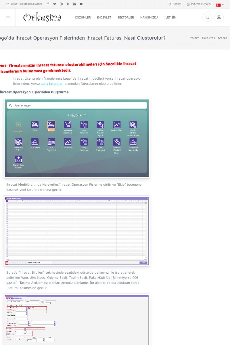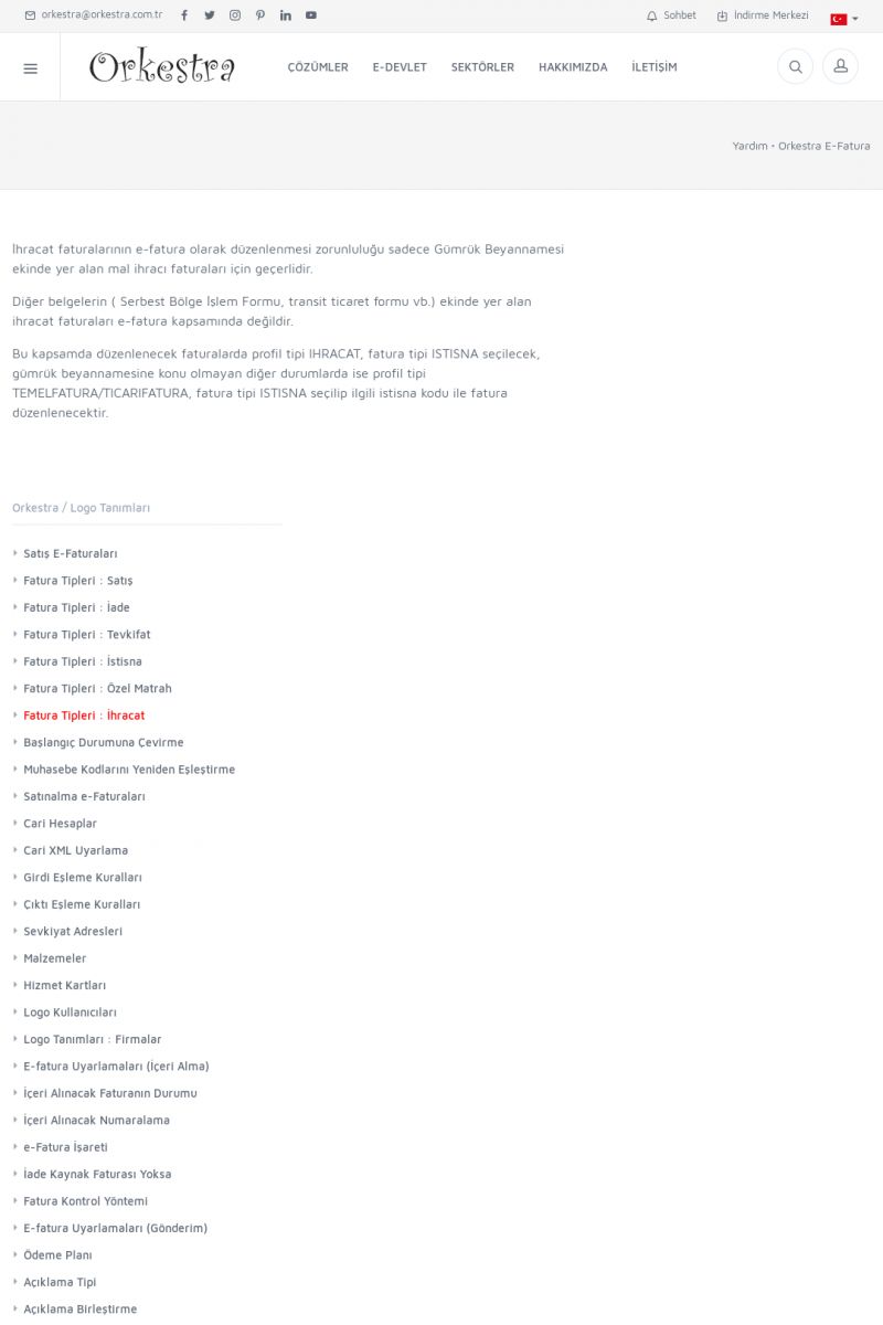 | 8 |  | Orkestra İhracat E-Fatura İHRACAT E-FATURA ( E-İHRACAT ) ------------------------- Orkestra İhracat E-Fatura çözümü ile muhasebe programından kesmiş olduğunuz faturaları e-ihracat faturası olarak gönderebilirsiniz. Muhasebe programınızda ihracat modülü olmaması durumunda Orkestra içerisinden bilgi girişi yapabilirsiniz. KISA ERİŞİM KODU : XYIJ / ARA8 | |