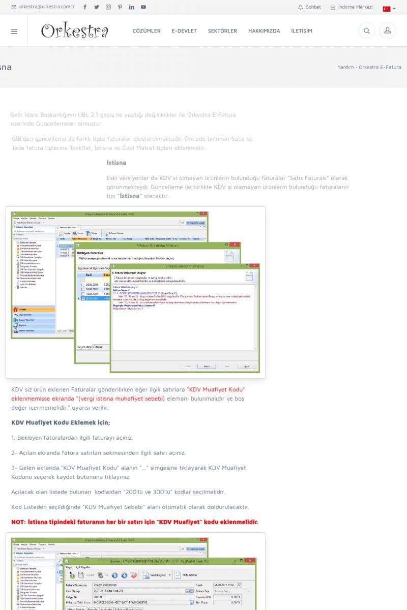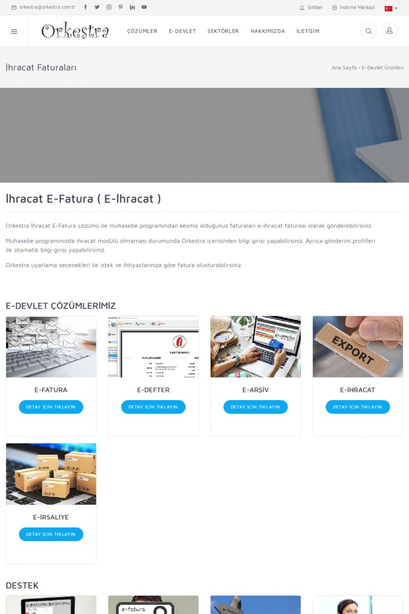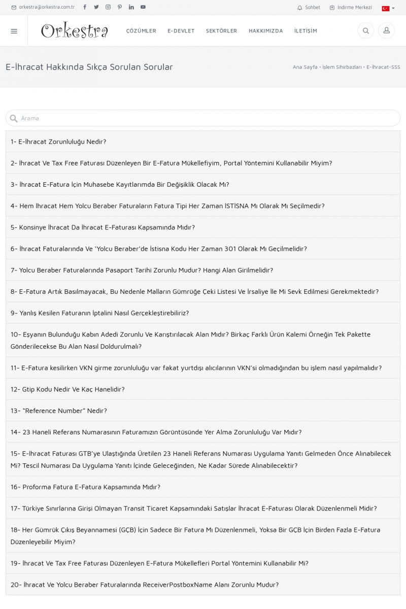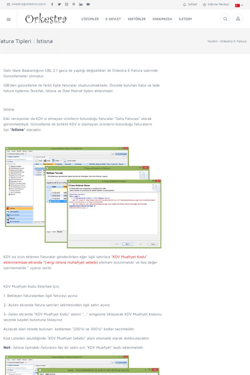 | 8 |  | Orkestra İhracat E-Fatura İHRACAT E-FATURA ( E-İHRACAT ) ------------------------- Orkestra İhracat E-Fatura çözümü ile muhasebe programından kesmiş olduğunuz faturaları e-ihracat faturası olarak gönderebilirsiniz. Muhasebe programınızda ihracat modülü olmaması durumunda Orkestra içerisinden bilgi girişi yapabilirsiniz. KISA ERİŞİM KODU : XYIJ / ARA8 | |