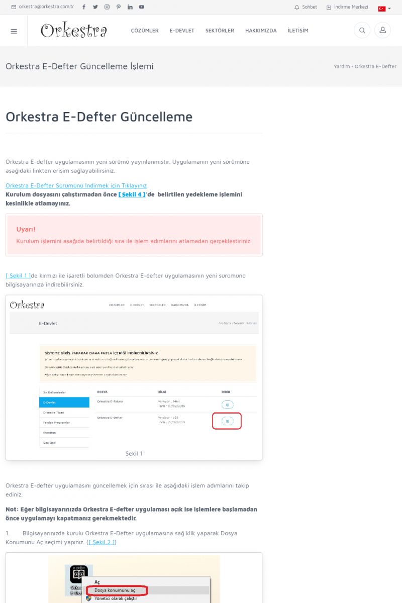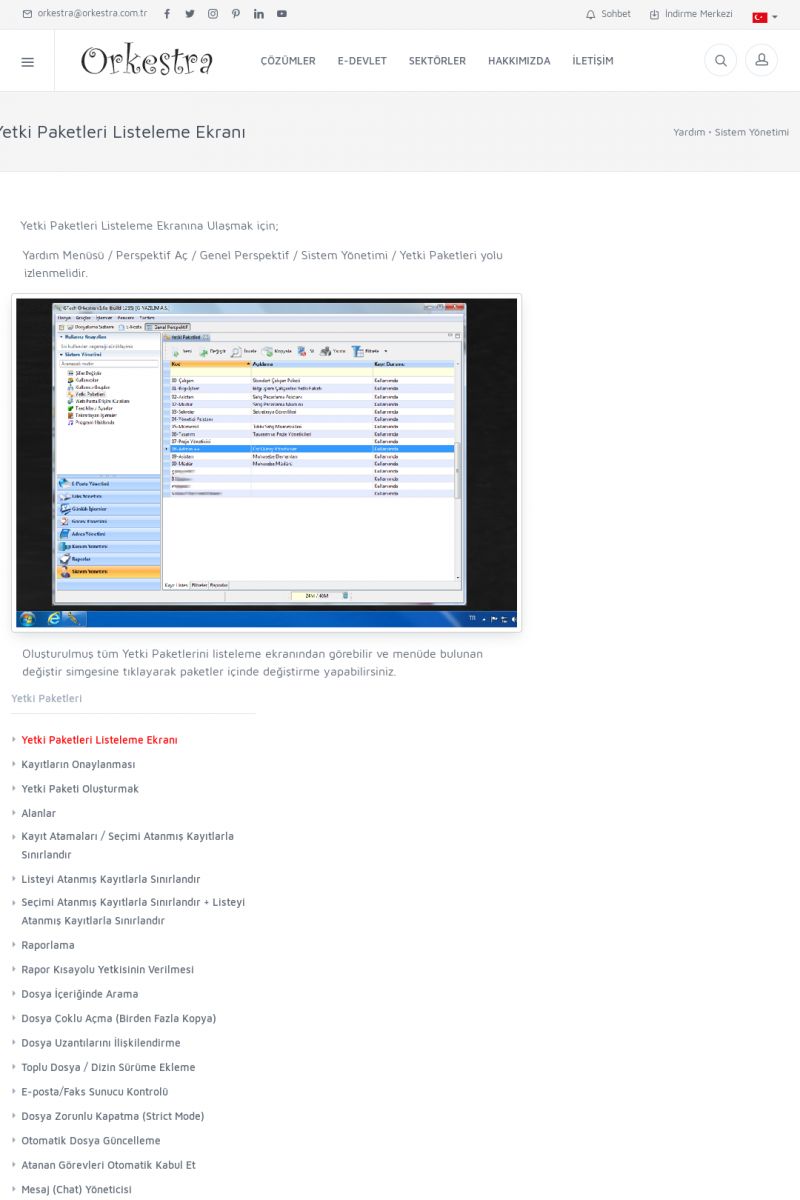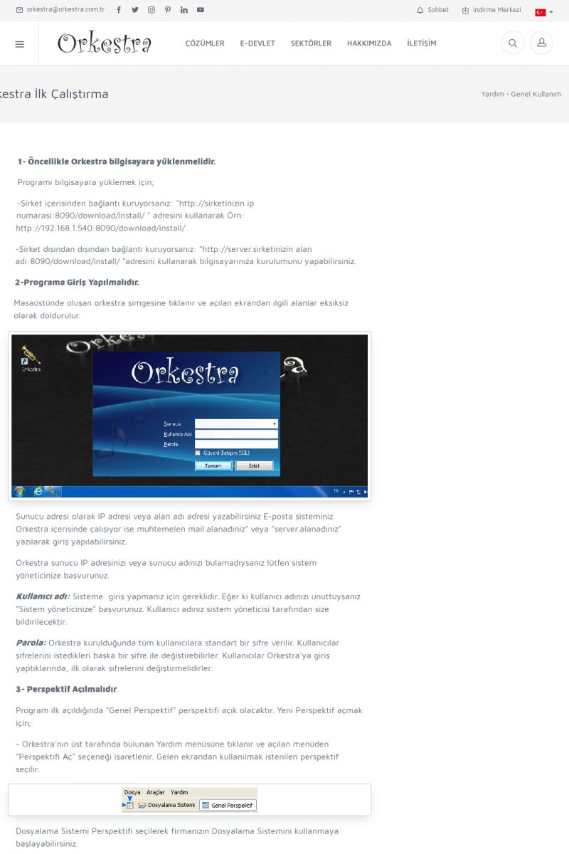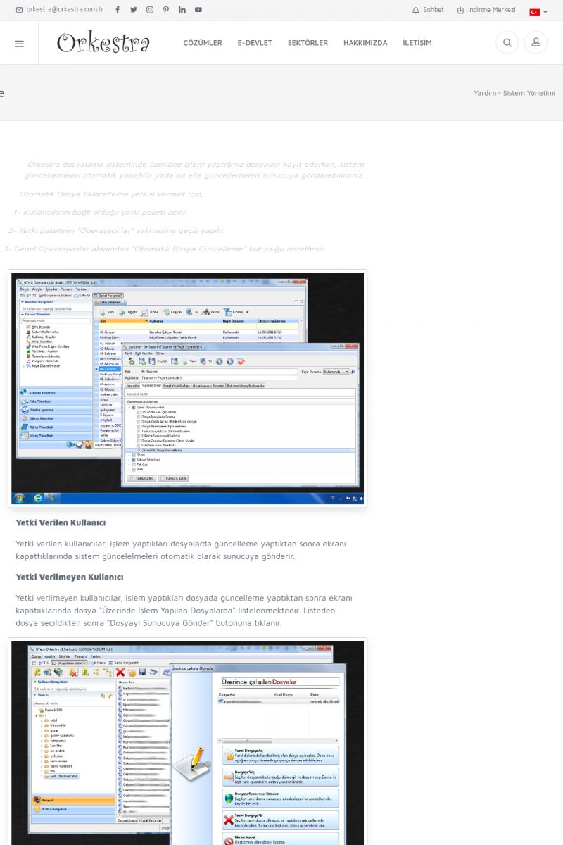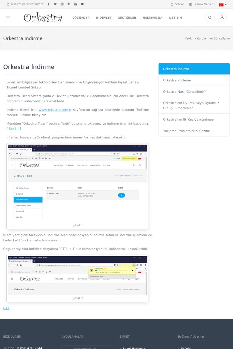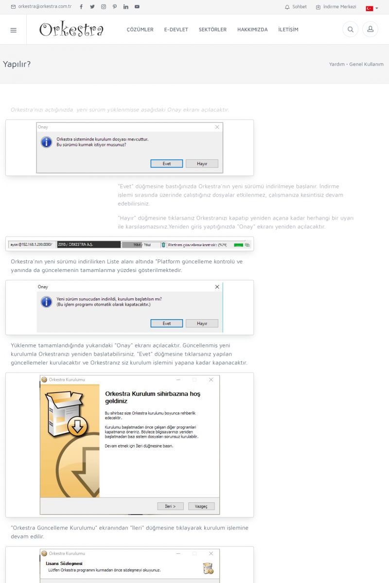 | 70 |  | Kurulum ve GüncellemeORKESTRA İNDIRME Orkestra kurulumu yapmak için öncelikle Orkestra'nın indirilmesi gerekmektedir. Detay İçin Tıklayınız [/index.php?sayfa=yardim&m=2&y=1] ORKESTRA YÜKLEME Orkestra nın yüklemesinin nasıl yapılacağının belirtildiği dokümandır. Detay İçin Tıklayınız [/index. KISA ERİŞİM KODU : XYCSI / ARA70 | |