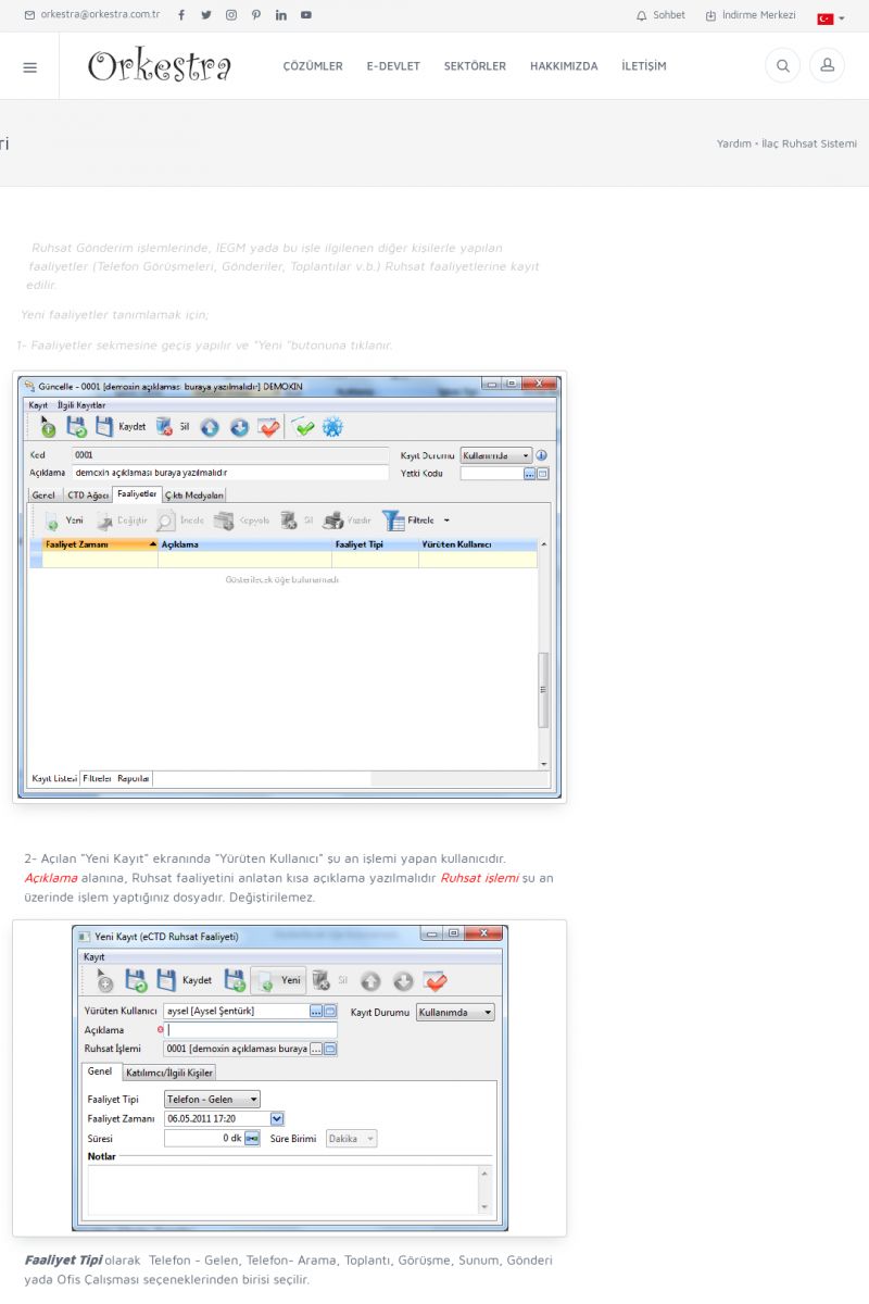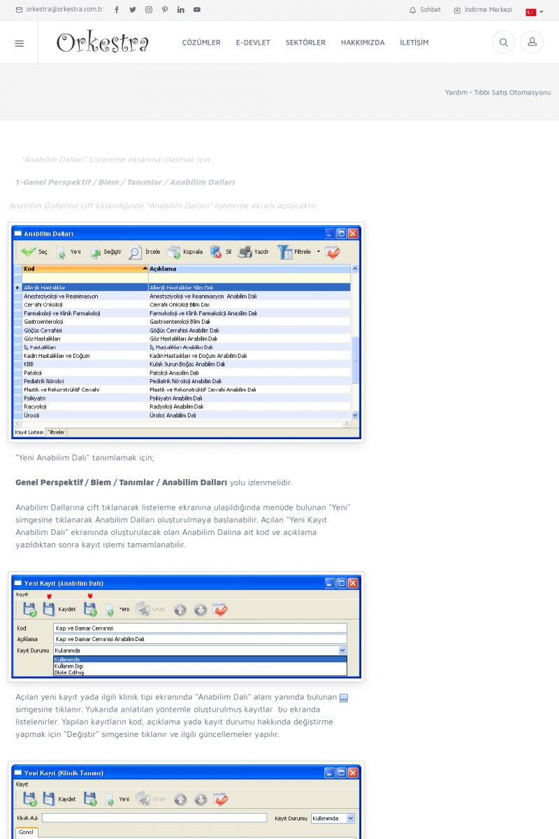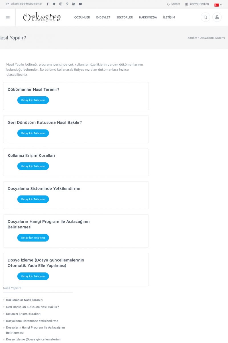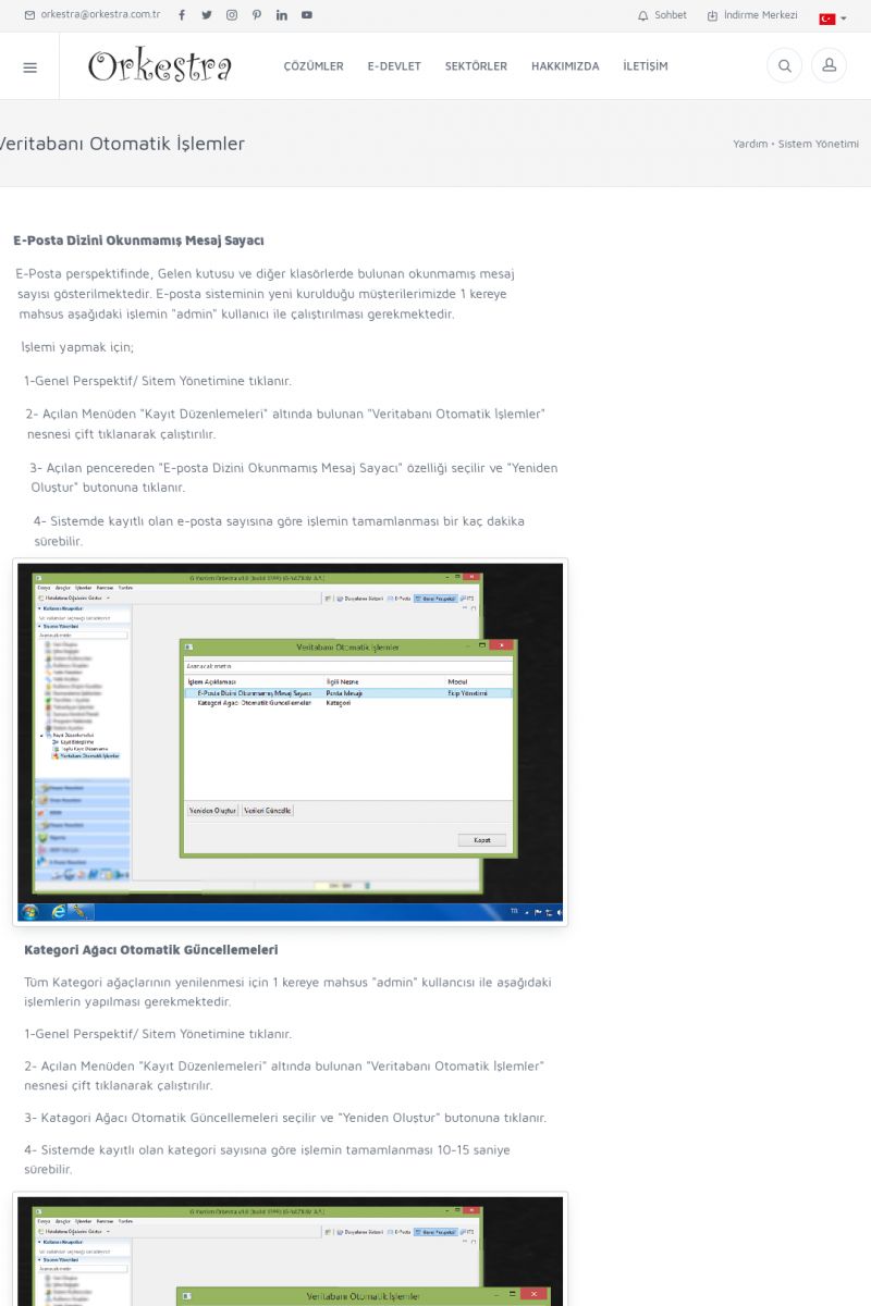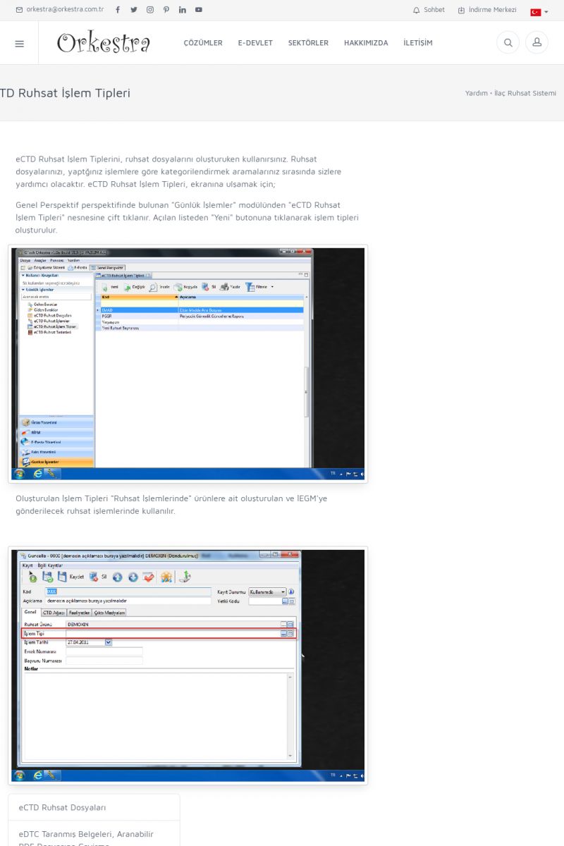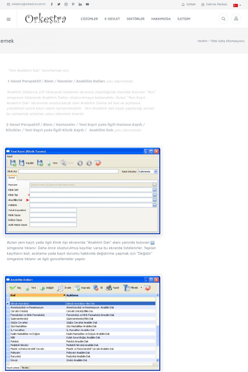 | 70 |  | Kurulum ve GüncellemeORKESTRA İNDIRME Orkestra kurulumu yapmak için öncelikle Orkestra'nın indirilmesi gerekmektedir. Detay İçin Tıklayınız [/index.php?sayfa=yardim&m=2&y=1] ORKESTRA YÜKLEME Orkestra nın yüklemesinin nasıl yapılacağının belirtildiği dokümandır. Detay İçin Tıklayınız [/index. KISA ERİŞİM KODU : XYCSI / ARA70 | |