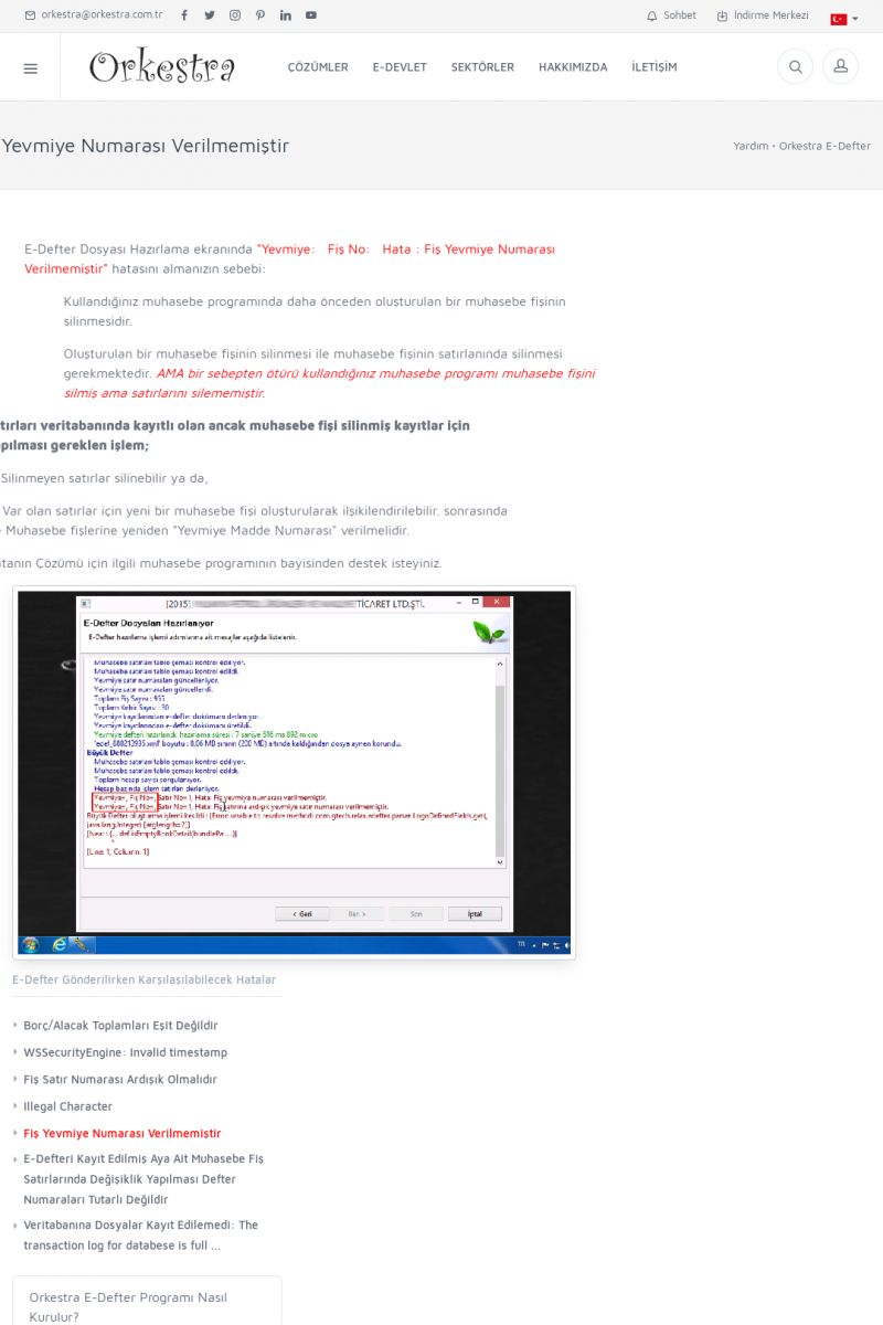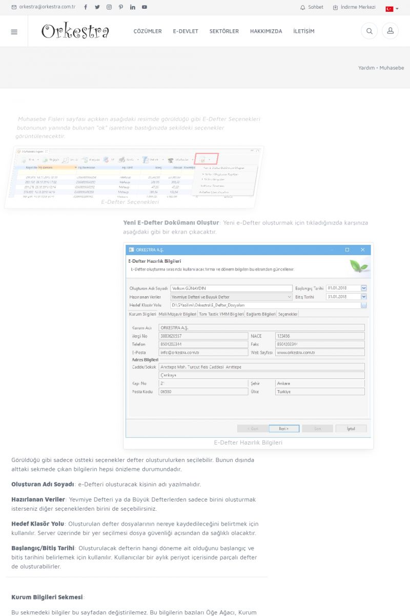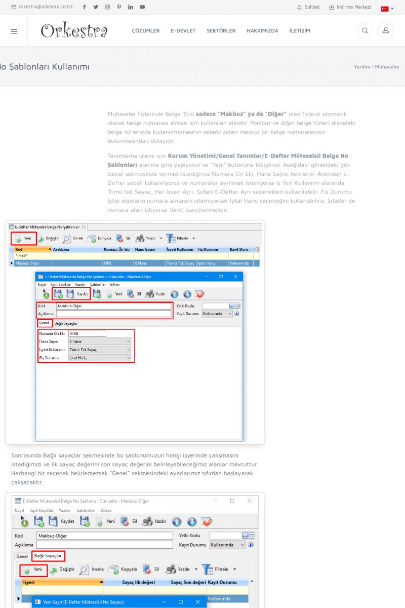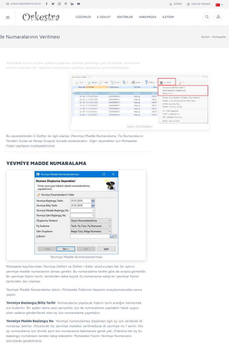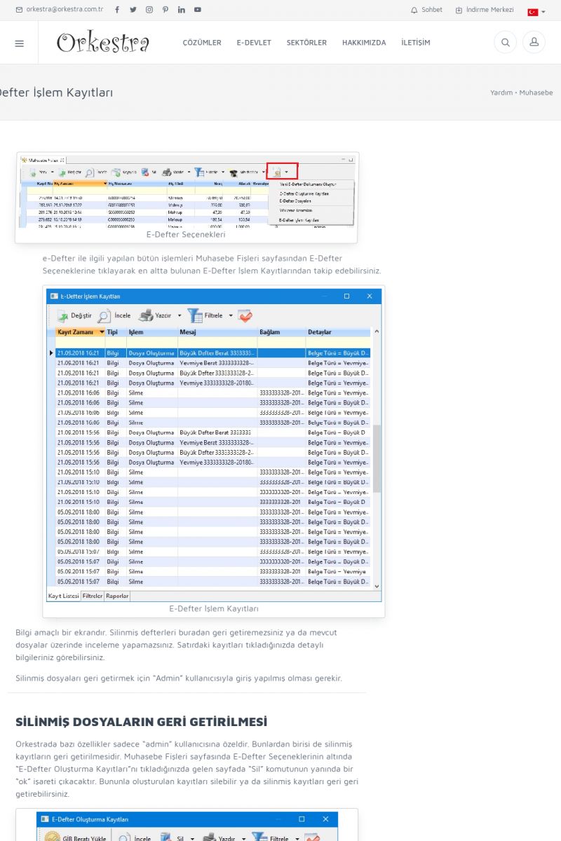 | 1819 |  | Orkestra Saklama Hizmeti Dosya TarayıcısıORKESTRA E-DEFTER İŞLEMLERI * e-Defter Oluşturma Yetkisi Nasıl Verilir? [/index.php?sayfa=yardim&m=14&y=1177&y2=1746] * e-Defter Ayarları Nasıl Yapılır? [/index.php?sayfa=yardim&m=14&y=1177&y2=1747] * Muhasebe Fişlerinin Yevmiye Madde Numaralarının Verilmesi [/index. KISA ERİŞİM KODU : XYCSAM / ARA1820 | |