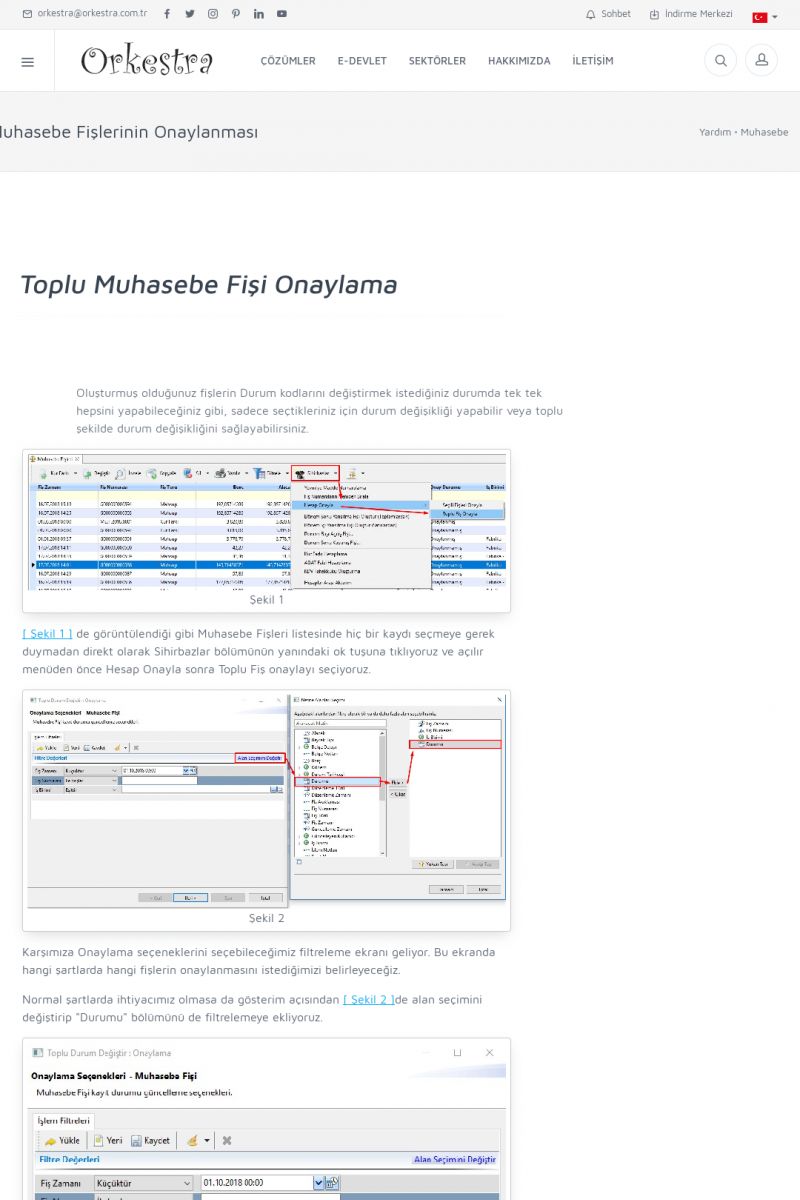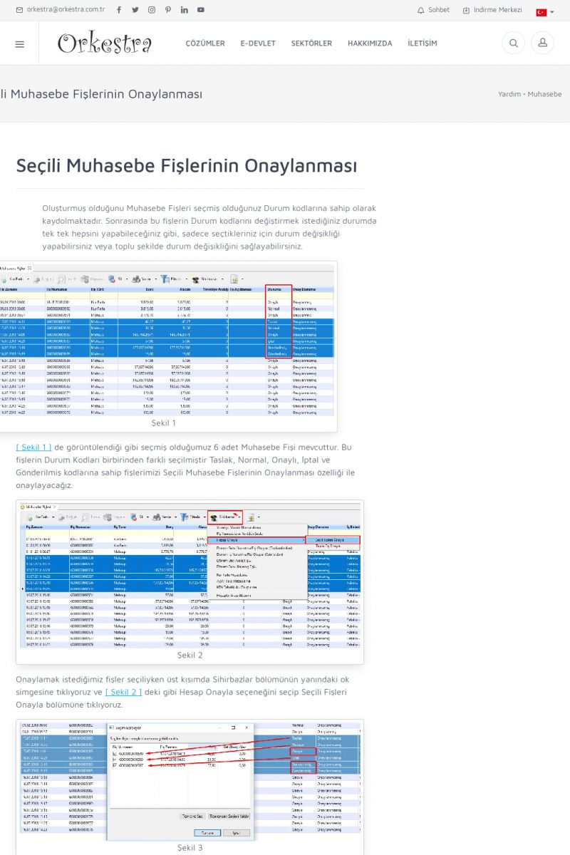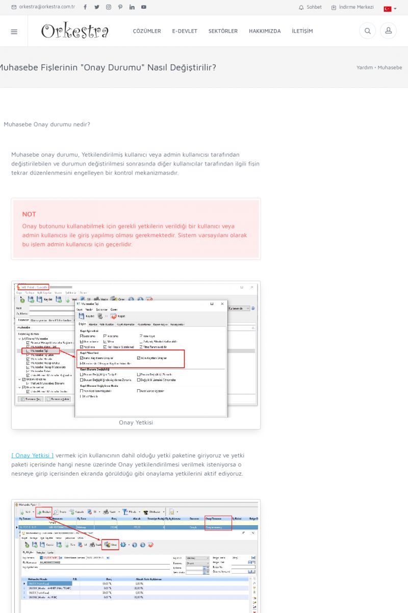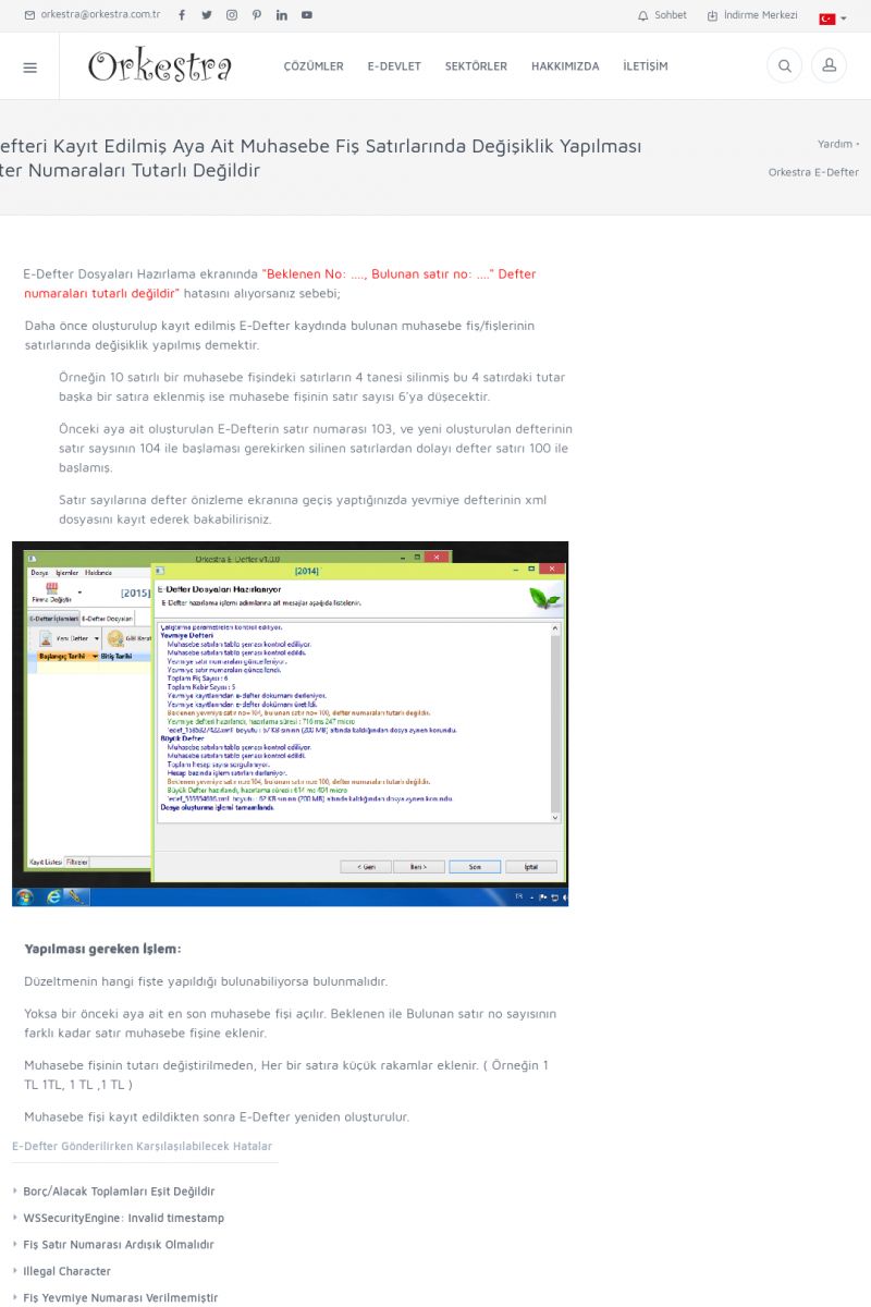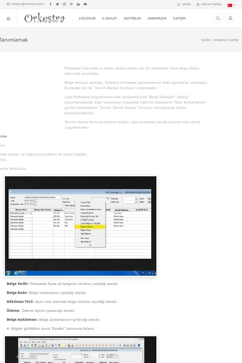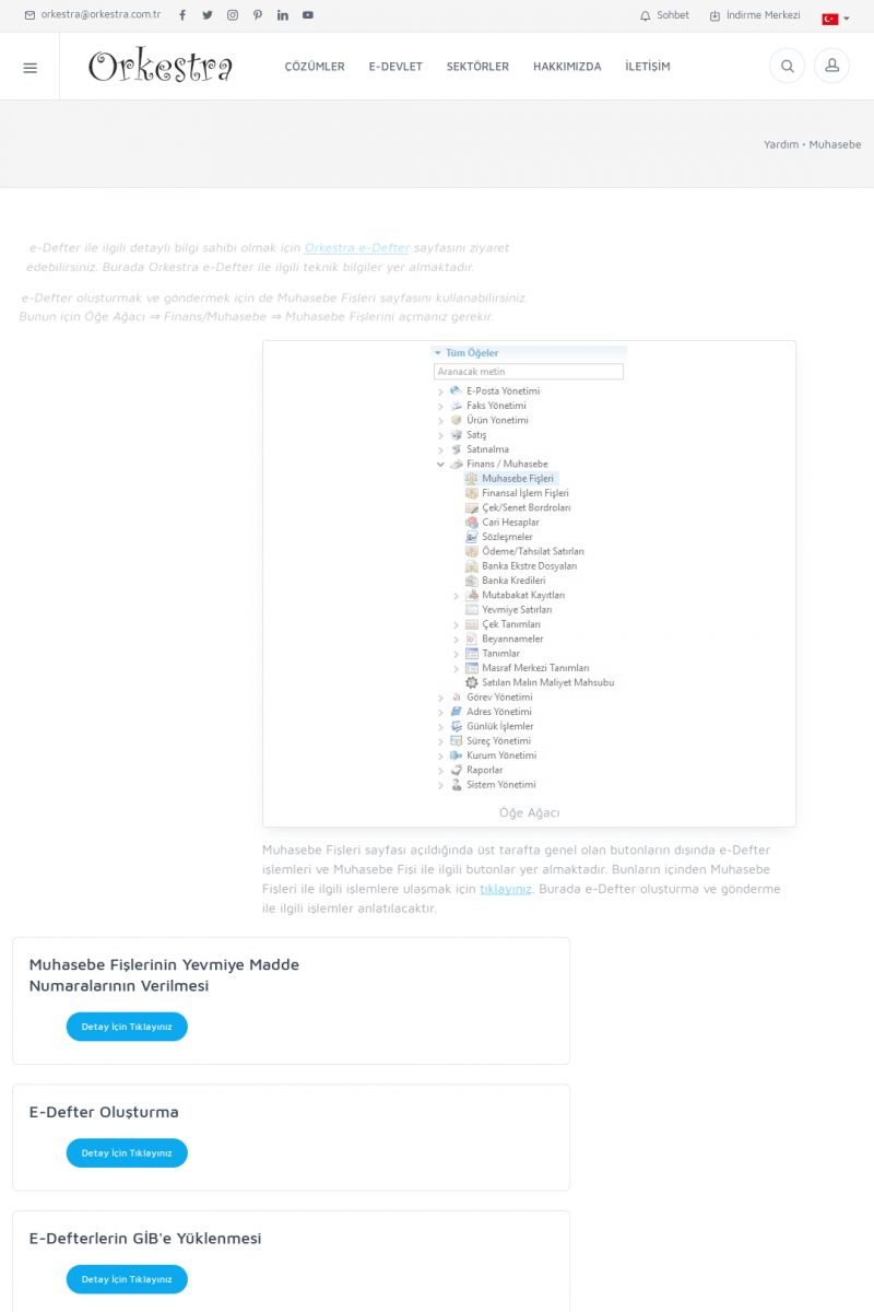 | 1819 |  | Orkestra Saklama Hizmeti Dosya TarayıcısıORKESTRA E-DEFTER İŞLEMLERI * e-Defter Oluşturma Yetkisi Nasıl Verilir? [/index.php?sayfa=yardim&m=14&y=1177&y2=1746] * e-Defter Ayarları Nasıl Yapılır? [/index.php?sayfa=yardim&m=14&y=1177&y2=1747] * Muhasebe Fişlerinin Yevmiye Madde Numaralarının Verilmesi [/index. KISA ERİŞİM KODU : XYCSAM / ARA1820 | |