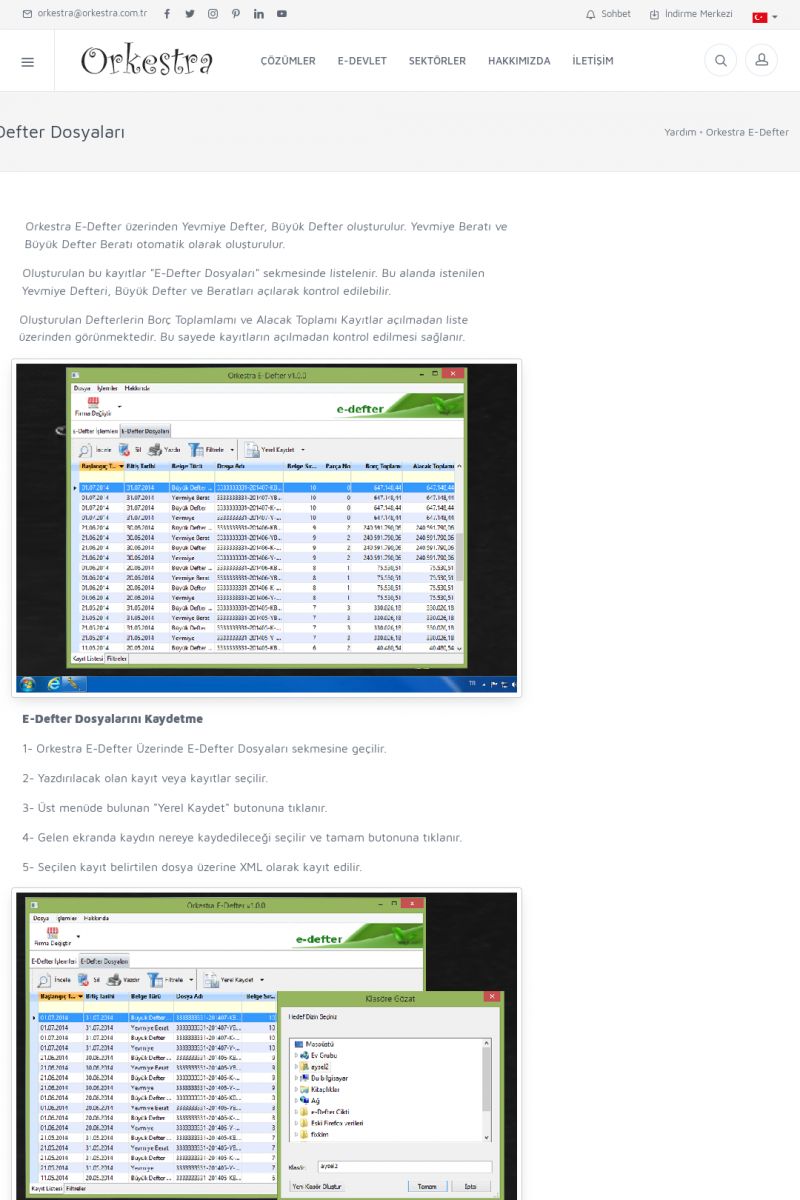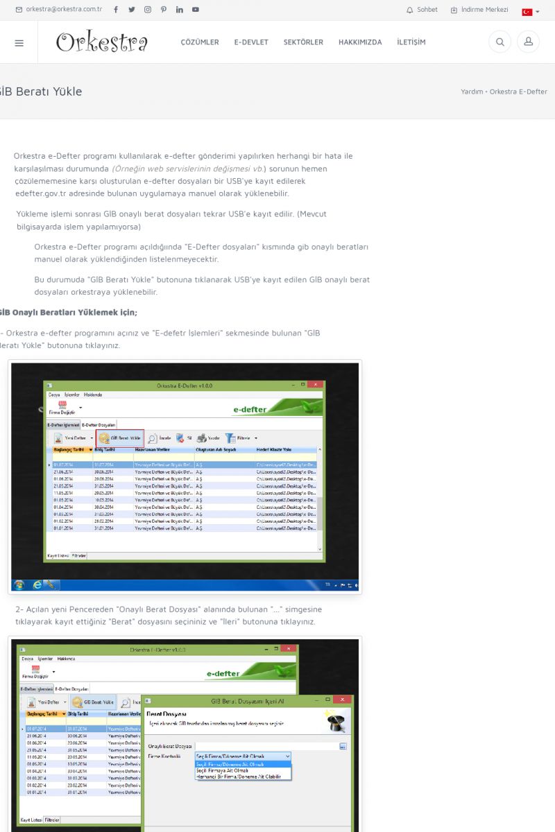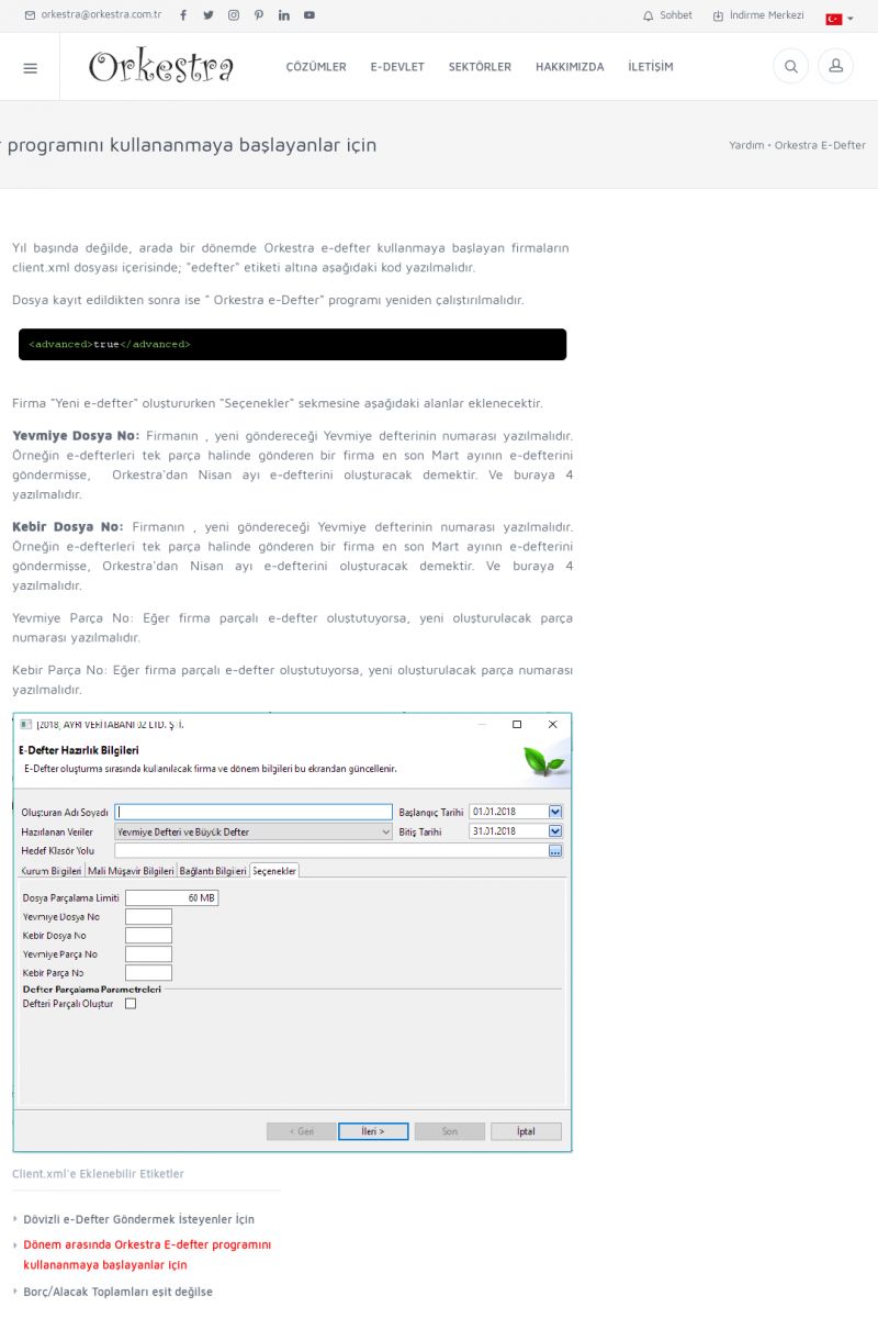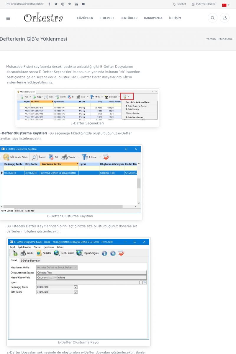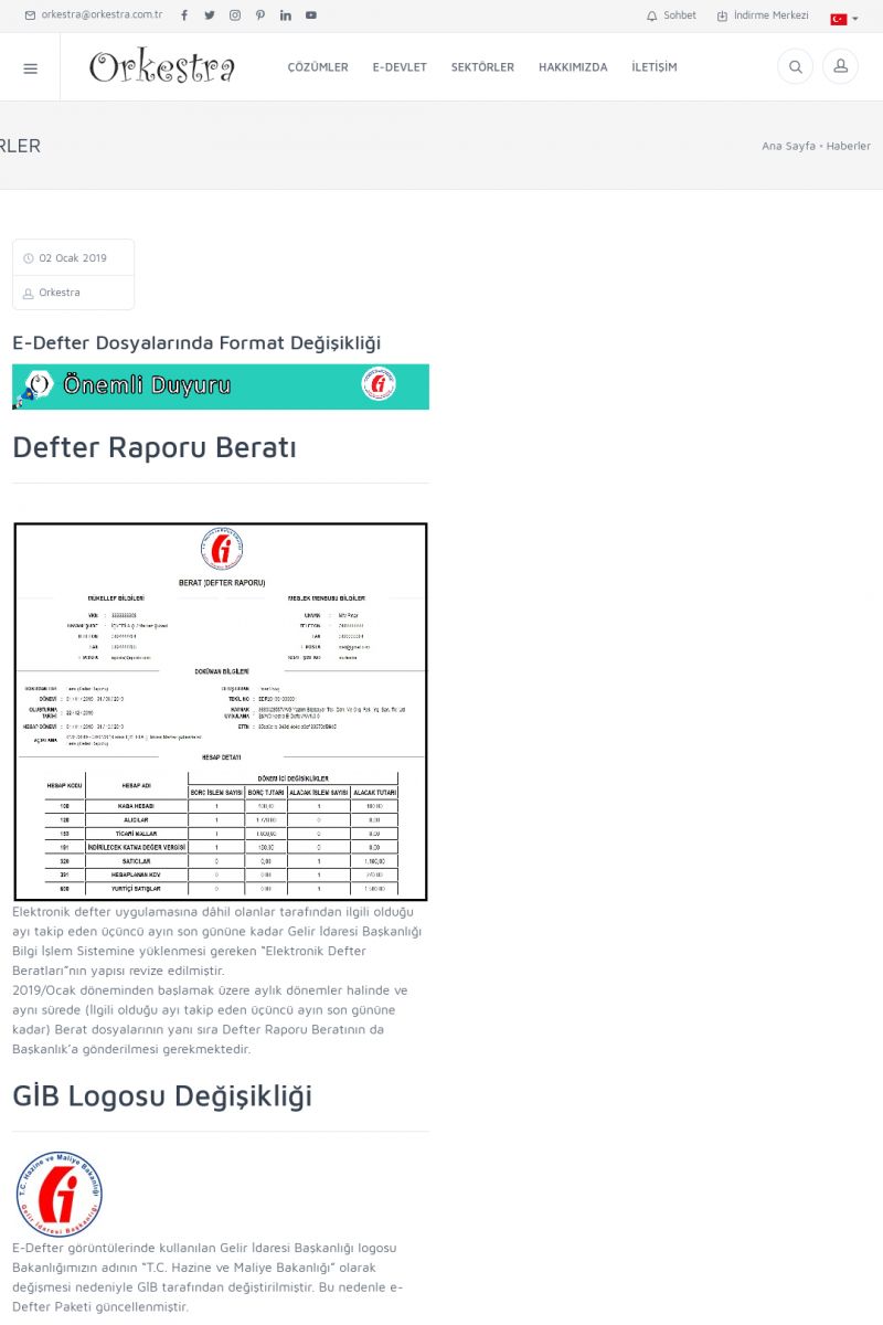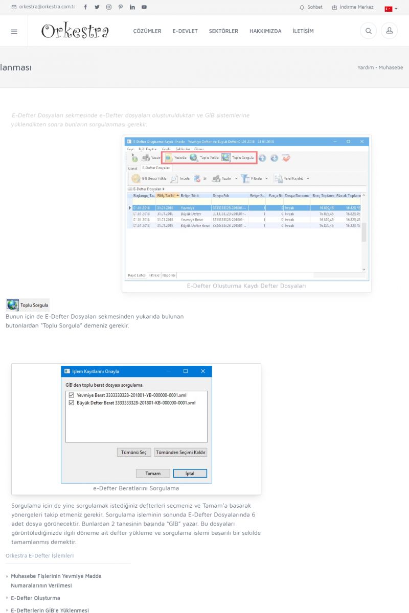 | 6 |  | Orkestra E-DefterOtomatik E-Defter Berat Gönderimi ORKESTRA E-DEFTER ------------------------- Orkestra e-defter çözümü ile muhasebe programınızda oluşturduğunuz muhasebe fişlerinden e-defter ve beratlarını oluşturabilirsiniz. Orkestra e-defter programı muhasebe programınızın versiyonun bağımsız olarak çalışmaktadır. KISA ERİŞİM KODU : XYGH / ARA6 | |