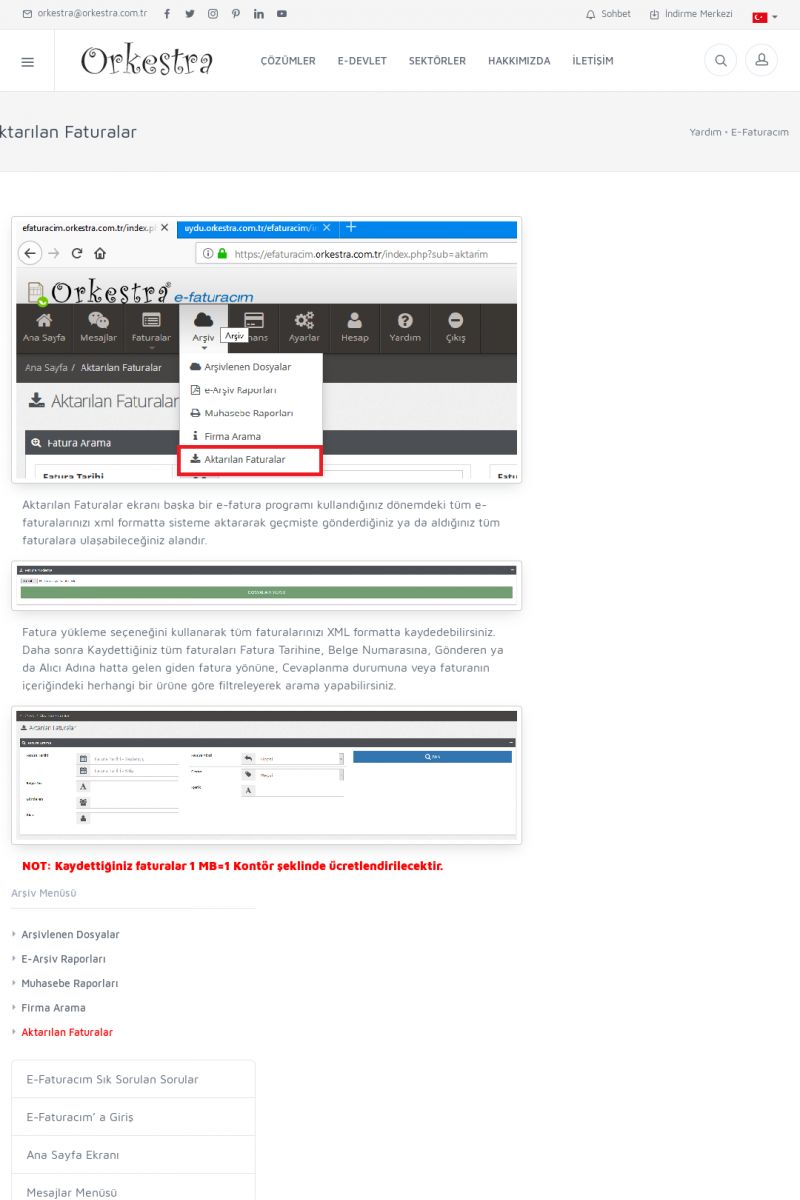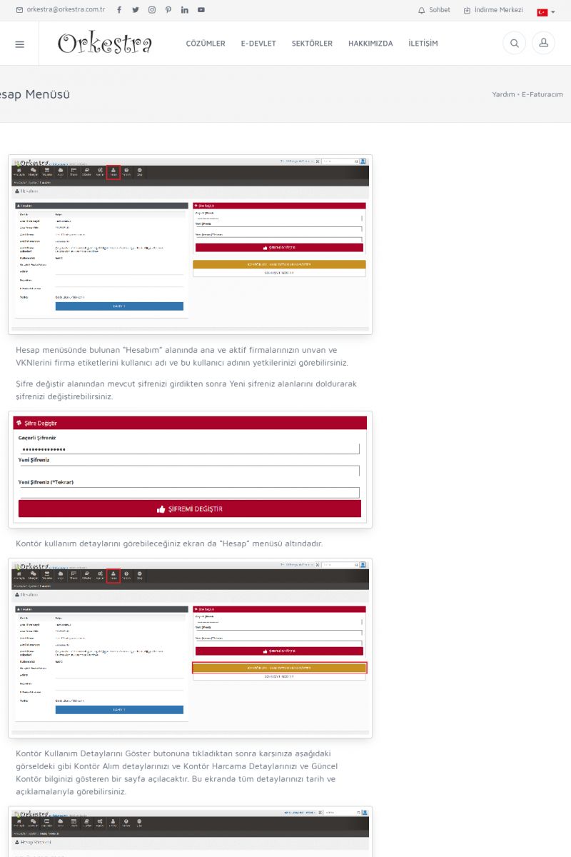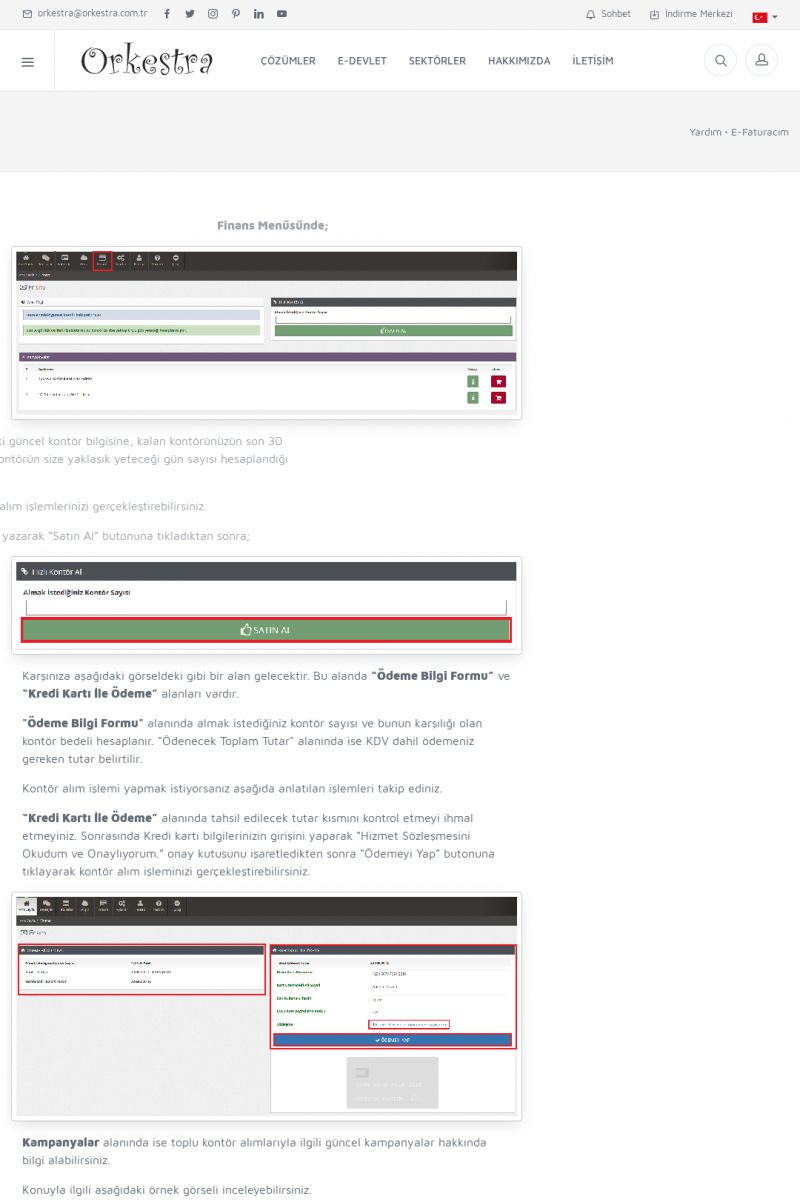 | 1823 |  | Kontör BilgisiGET METODU İLE KONTÖR BİLGİSİ ÖĞRENME Kontör bilgisini HTTP üzerinden GET metodu ile aşağıdaki formata uygun olarak sorgulayabilirsiniz. https://efaturacim.orkestra.com.tr/servis.php?action=kontorsorgu&kullanici=.... KISA ERİŞİM KODU : XYCSEQ / ARA1824 | |