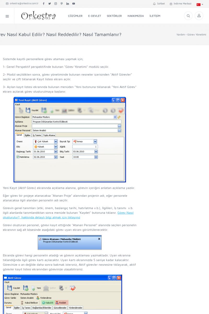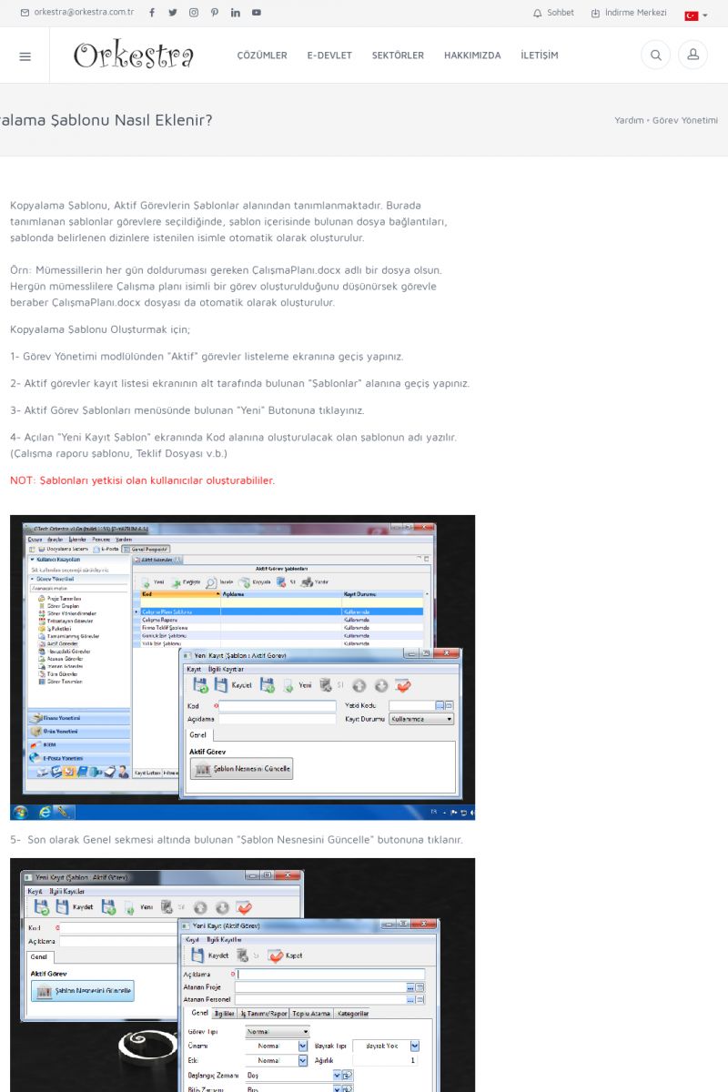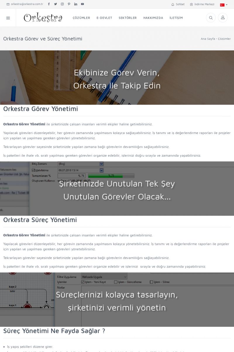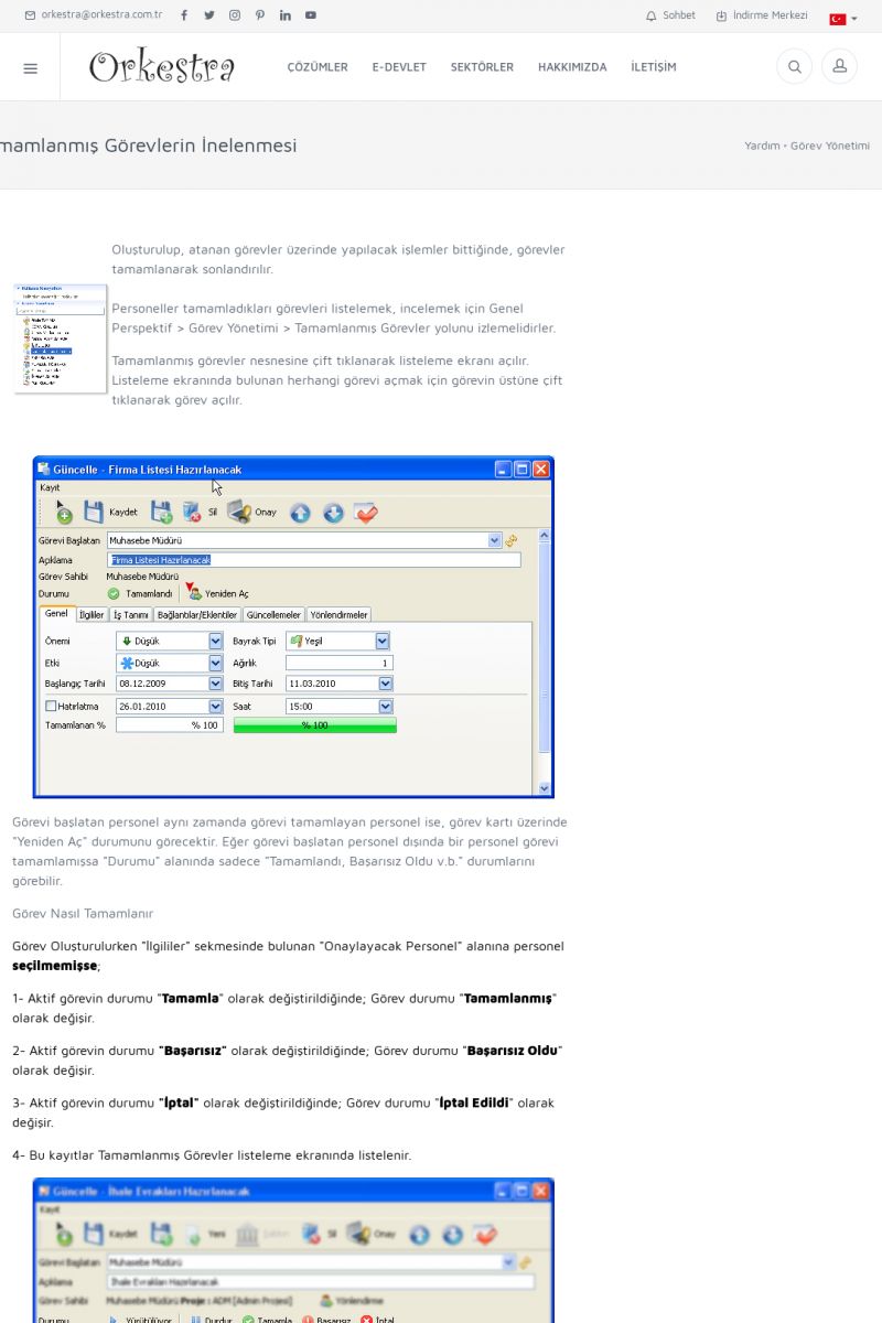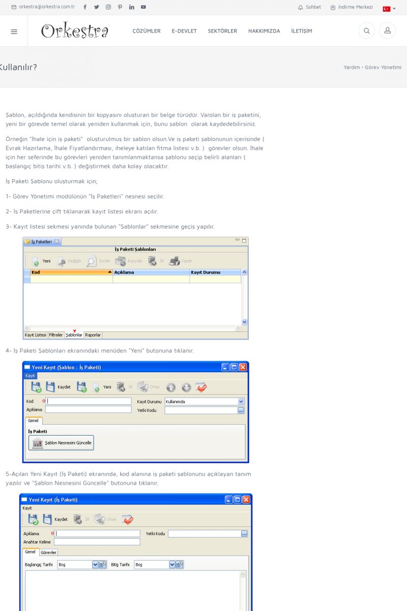 | 2 |  | Orkestra Görev Yönetimi , Süreç Yönetimi İle Şirketinizi Yönetin , İş AkışEkibinize Görev Verin, Orkestra İle Takip Edin ORKESTRA GÖREV YÖNETIMI ------------------------- ORKESTRA GÖREV YÖNETIMI ile şirketinizde çalışan insanları verimli ekipler haline getirebilirsiniz. Yapılacak görevleri düzenleyebilir, her görevin zamanında yapılmasını kolayca sağlayabilirsiniz. KISA ERİŞİM KODU : XYCD / ARA2 | |