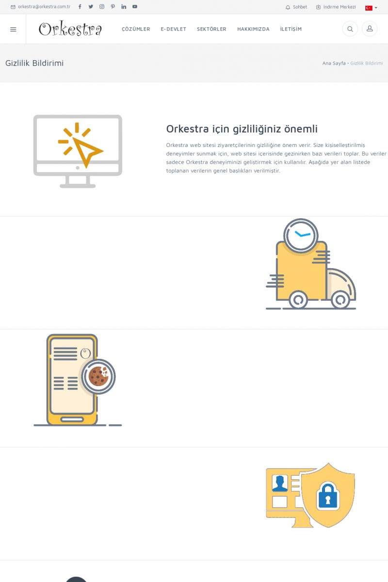 | 23 |  | Gizlilik Bildirimi, Orkestra Ticari Yazılım[Gizlilik Bildirimi] ORKESTRA IÇIN GIZLILIĞINIZ ÖNEMLI Orkestra web sitesi ziyaretçilerinin gizliliğine önem verir. Size kişiselleştirilmiş deneyimler sunmak için, web sitesi içerisinde gezinirken bazı verileri toplar. Bu veriler sadece Orkestra deneyiminizi geliştirmek için kullanılır. KISA ERİŞİM KODU : XYXG / ARA23 | |