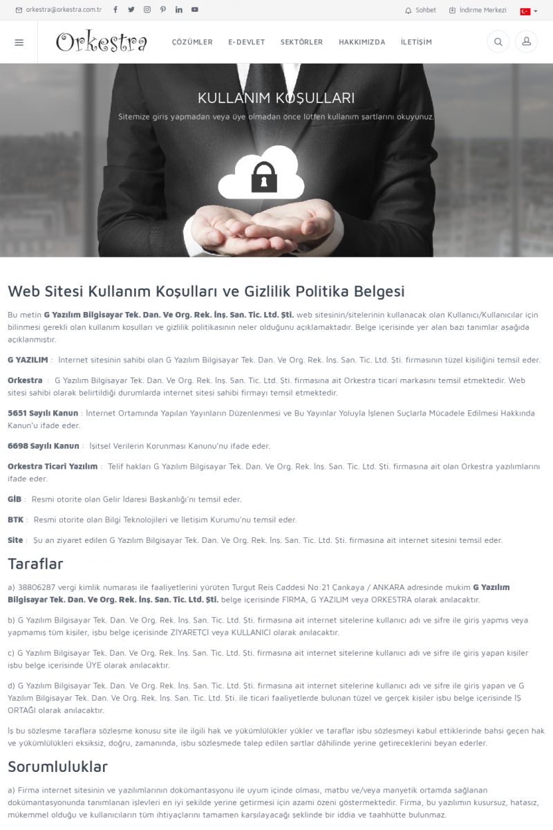 | 24 |  | Orkestra Ticari Yazılım, Kullanım ŞartlarıKULLANIM KOŞULLARI SITEMIZE GIRIŞ YAPMADAN VEYA ÜYE OLMADAN ÖNCE LÜTFEN KULLANIM ŞARTLARINI OKUYUNUZ. WEB SITESI KULLANIM KOŞULLARI VE GIZLILIK POLITIKA BELGESI Bu metin G YAZILIM BILGISAYAR TEK. DAN. VE ORG. REK. İNŞ. SAN. TIC. LTD. ŞTI. KISA ERİŞİM KODU : XYYH / ARA24 | |