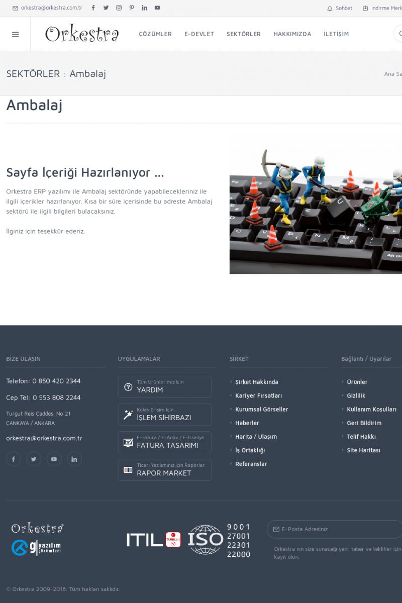 | 27 |  | Ambalaj Sektörü İçin ERP Yazılımı, MRP ve CRM UygulamalarıAMBALAJ ------------------------- SAYFA İÇERIĞI HAZIRLANIYOR ... Orkestra ERP yazılımı ile Ambalaj sektöründe yapabilecekleriniz ile ilgili içerikler hazırlanıyor. Kısa bir süre içerisinde bu adreste Ambalaj sektörü ile ilgili bilgileri bulacaksınız. İlginiz için teşekkür ederiz. KISA ERİŞİM KODU : XYBBK / ARA27 | |