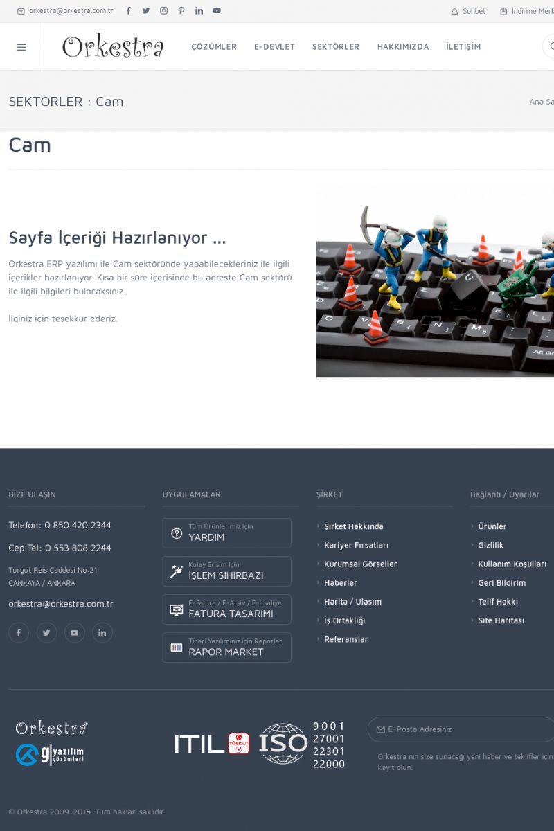 | 29 |  | Cam Sektörü İçin ERP Yazılımı, MRP ve CRM UygulamalarıCAM ------------------------- SAYFA İÇERIĞI HAZIRLANIYOR ... Orkestra ERP yazılımı ile Cam sektöründe yapabilecekleriniz ile ilgili içerikler hazırlanıyor. Kısa bir süre içerisinde bu adreste Cam sektörü ile ilgili bilgileri bulacaksınız. İlginiz için teşekkür ederiz. KISA ERİŞİM KODU : XYBDM / ARA29 | |