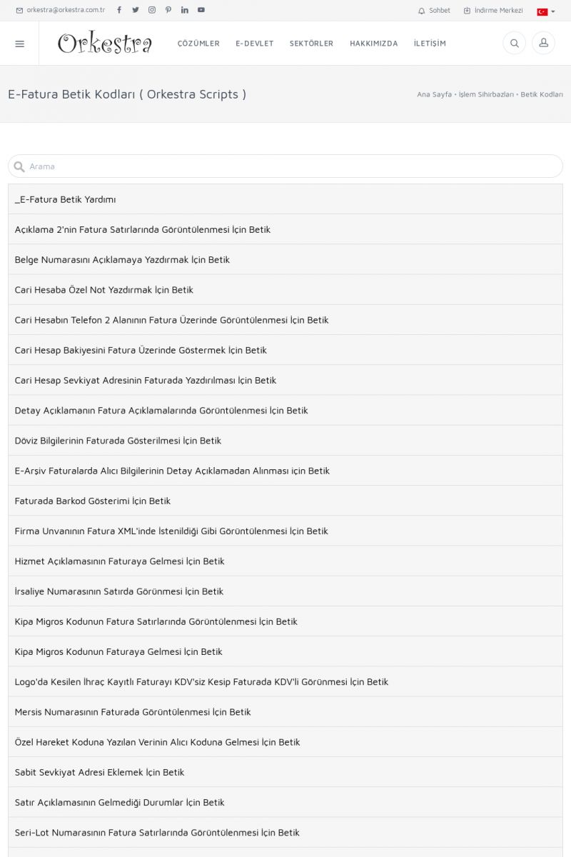 | 58 |  | E-Fatura Betik Kodları ( Orkestra Scripts ), İşlem Sihirhazı SayfasıE-Fatura Betik Kodları ( Orkestra Scripts ) başlıklı işlem sihirbazı sayfasına buradan erişebilirsiniz. E-Fatura Betik Kodları ( Orkestra Scripts ) hakkında data fazla bilgi için bu sayfayı ziyaret ediniz. KISA ERİŞİM KODU : XYCGO / ARA58 | |