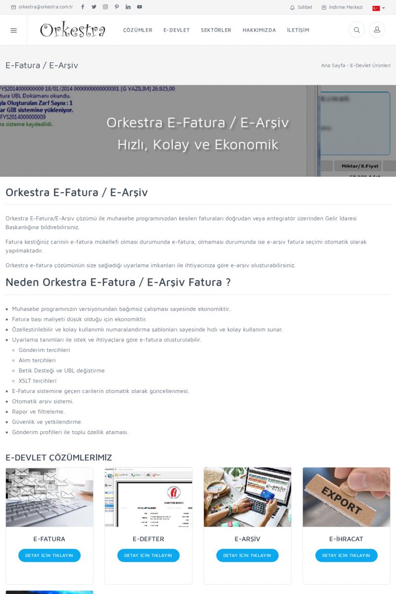 | 7 |  | Orkestra E-ArşivOrkestra E-Fatura / E-Arşiv Hızlı, Kolay ve Ekonomik ORKESTRA E-FATURA / E-ARŞIV ------------------------- Orkestra E-Fatura/E-Arşiv çözümü ile muhasebe programınızdan kesilen faturaları doğrudan veya entegratör üzerinden Gelir İdaresi Başkanlığına bildirebilirsiniz. KISA ERİŞİM KODU : XYHI / ARA7 | |